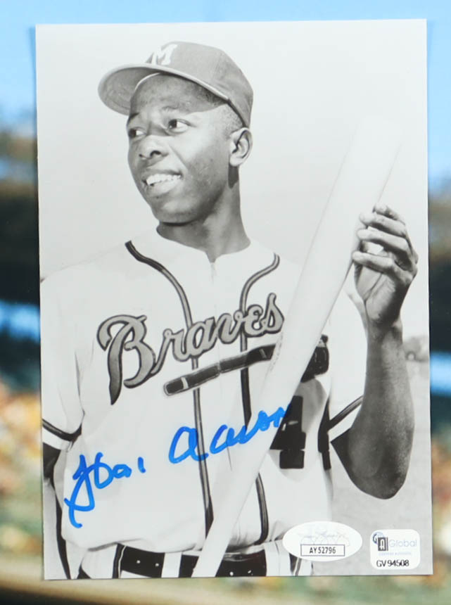 Custom frame measures 22" x 26" in size. Photograph is hand-signed by Hank Aaron (Atlanta Braves, HOF).