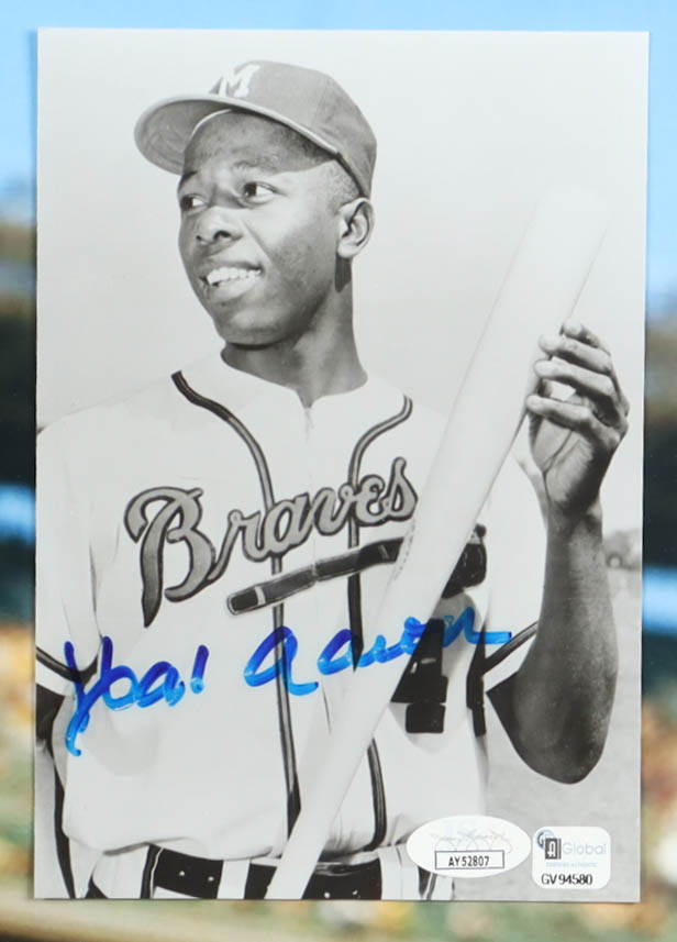 Custom frame measures 22" x 26" in size. Photograph is hand-signed by Hank Aaron (Atlanta Braves, HOF).