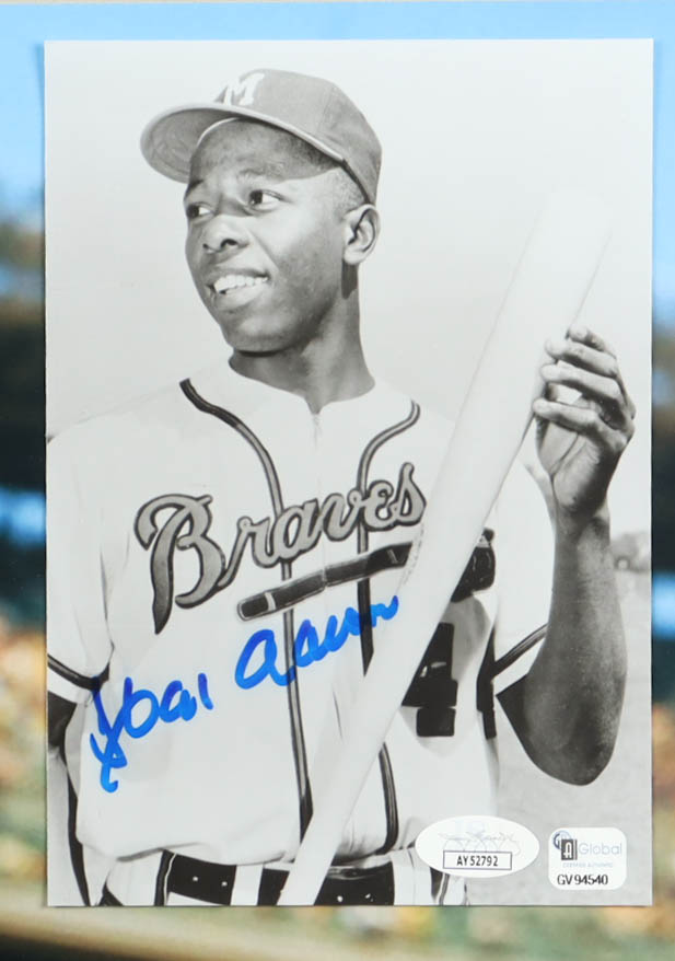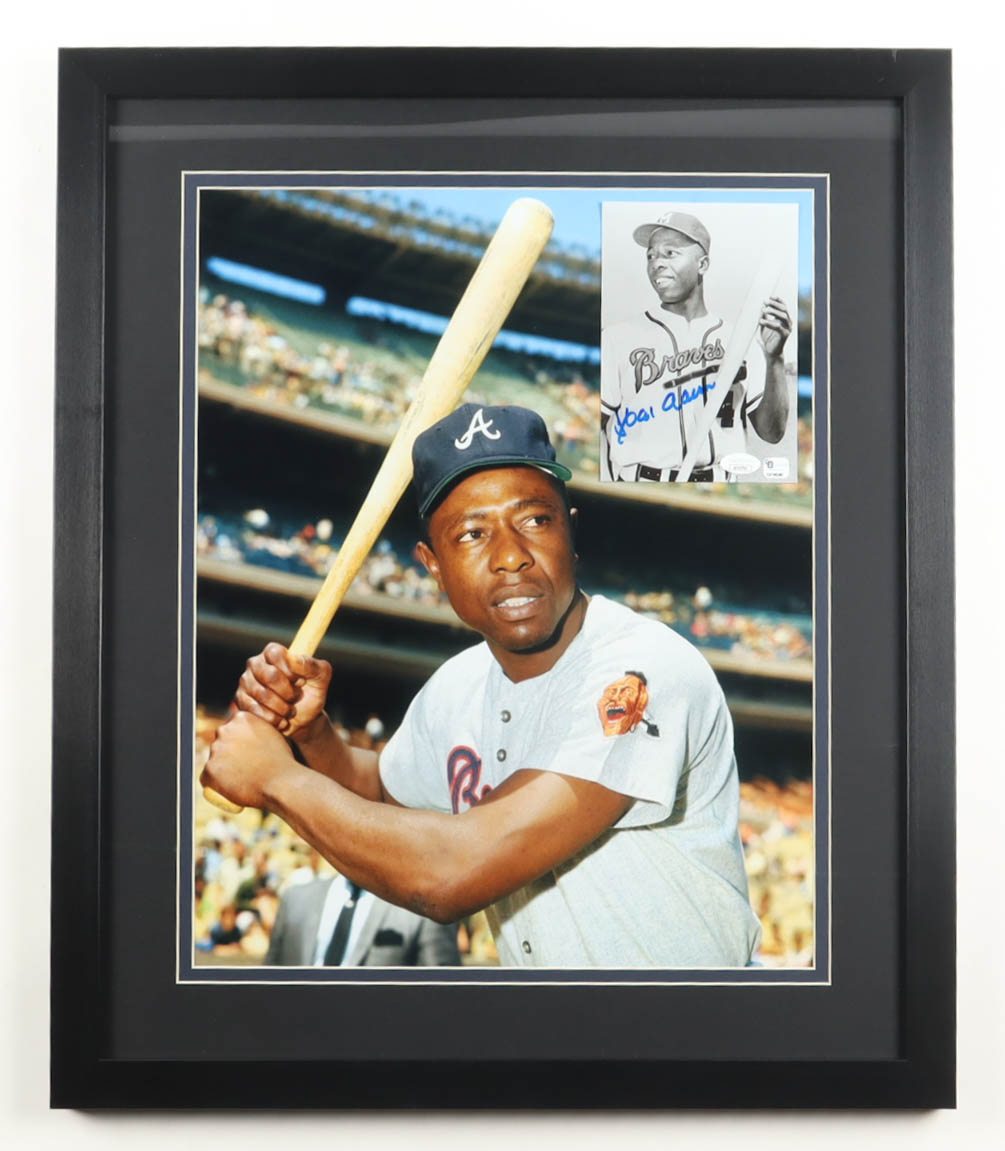 Custom frame measures 22" x 26" in size. Photograph is hand-signed by Hank Aaron (Atlanta Braves, HOF).