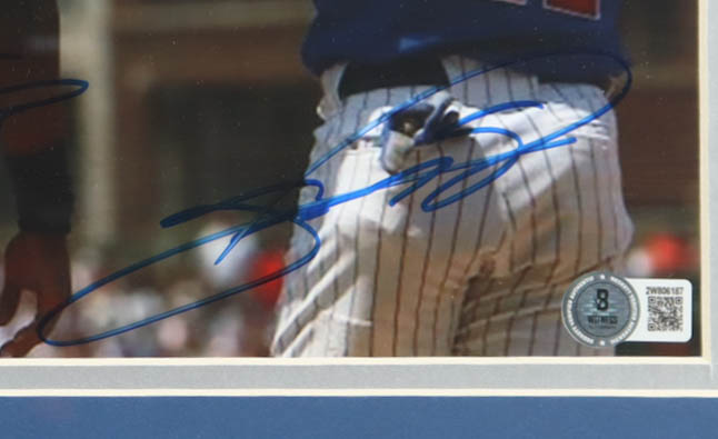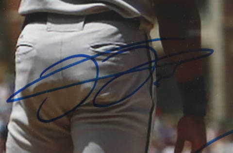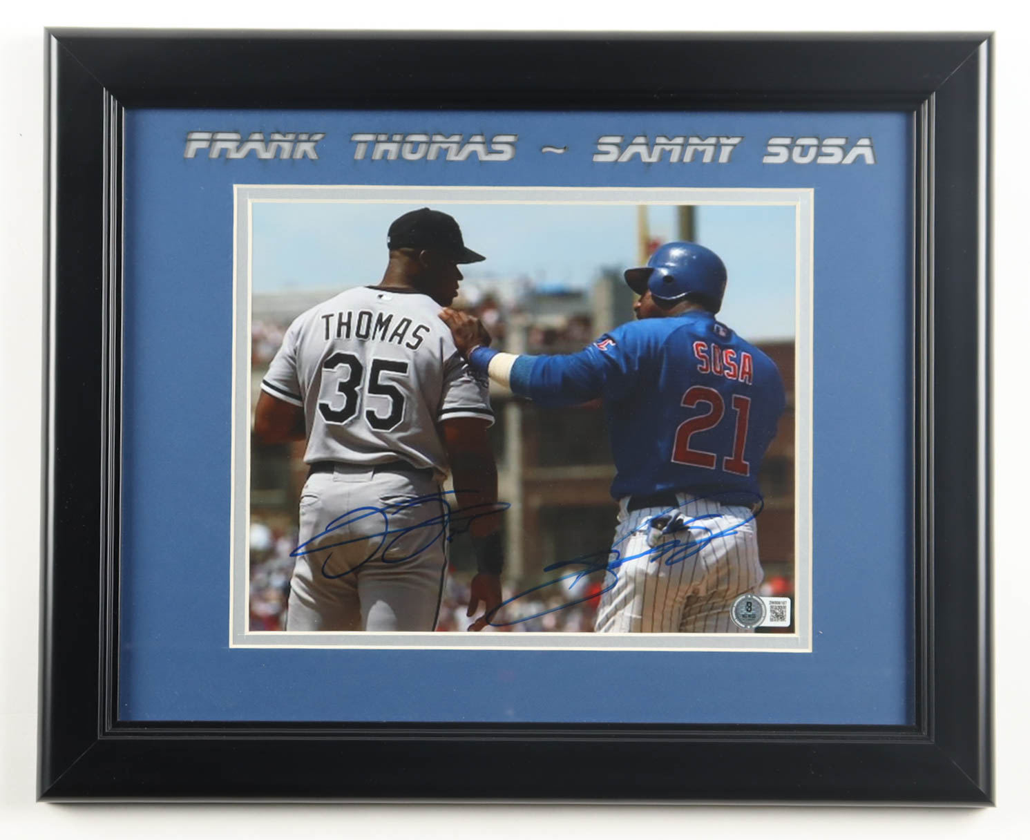 Custom frame measures approximately 13.5" x 16.5" in size and features a photo that has been hand-signed by Frank Thomas (New York Yankees, HOF) and Sammy Sosa (Chicago Cubs).