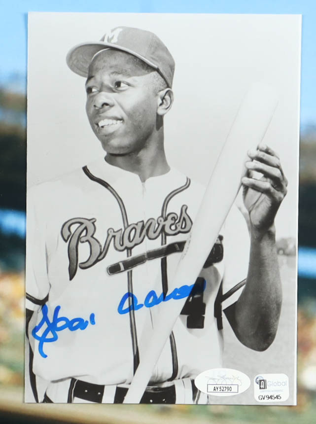 Custom frame measures 22" x 26" in size. Photograph is hand-signed by Hank Aaron (Atlanta Braves, HOF).