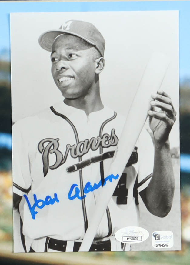 Custom frame measures 22" x 26" in size. Photograph is hand-signed by Hank Aaron (Atlanta Braves, HOF).