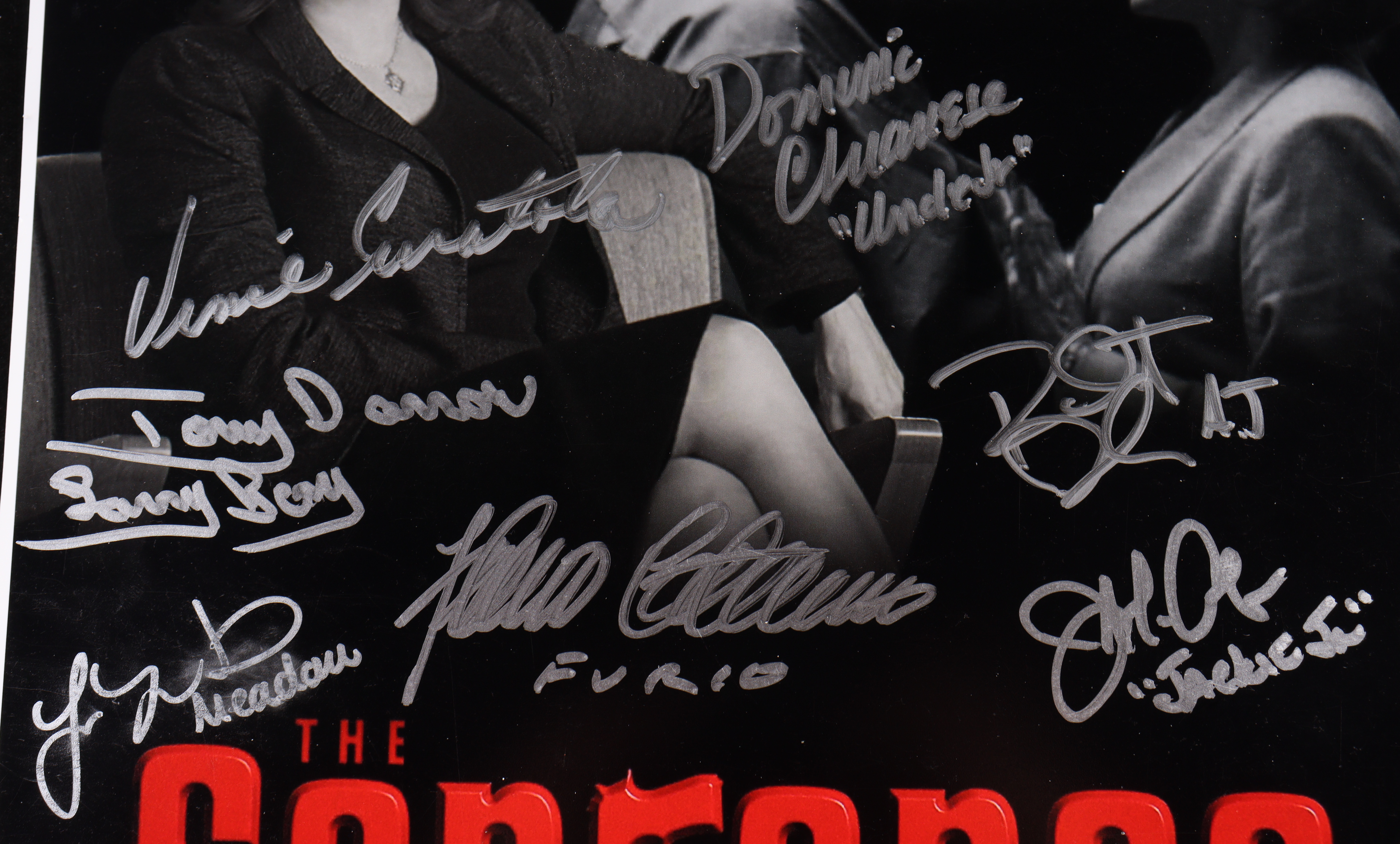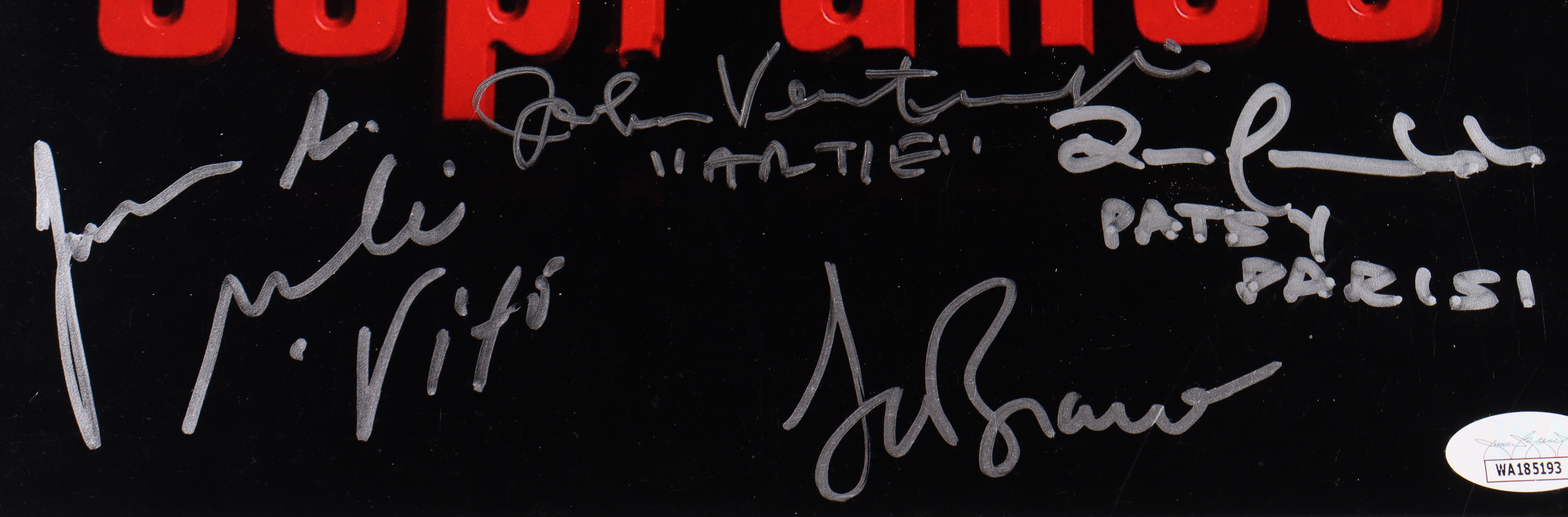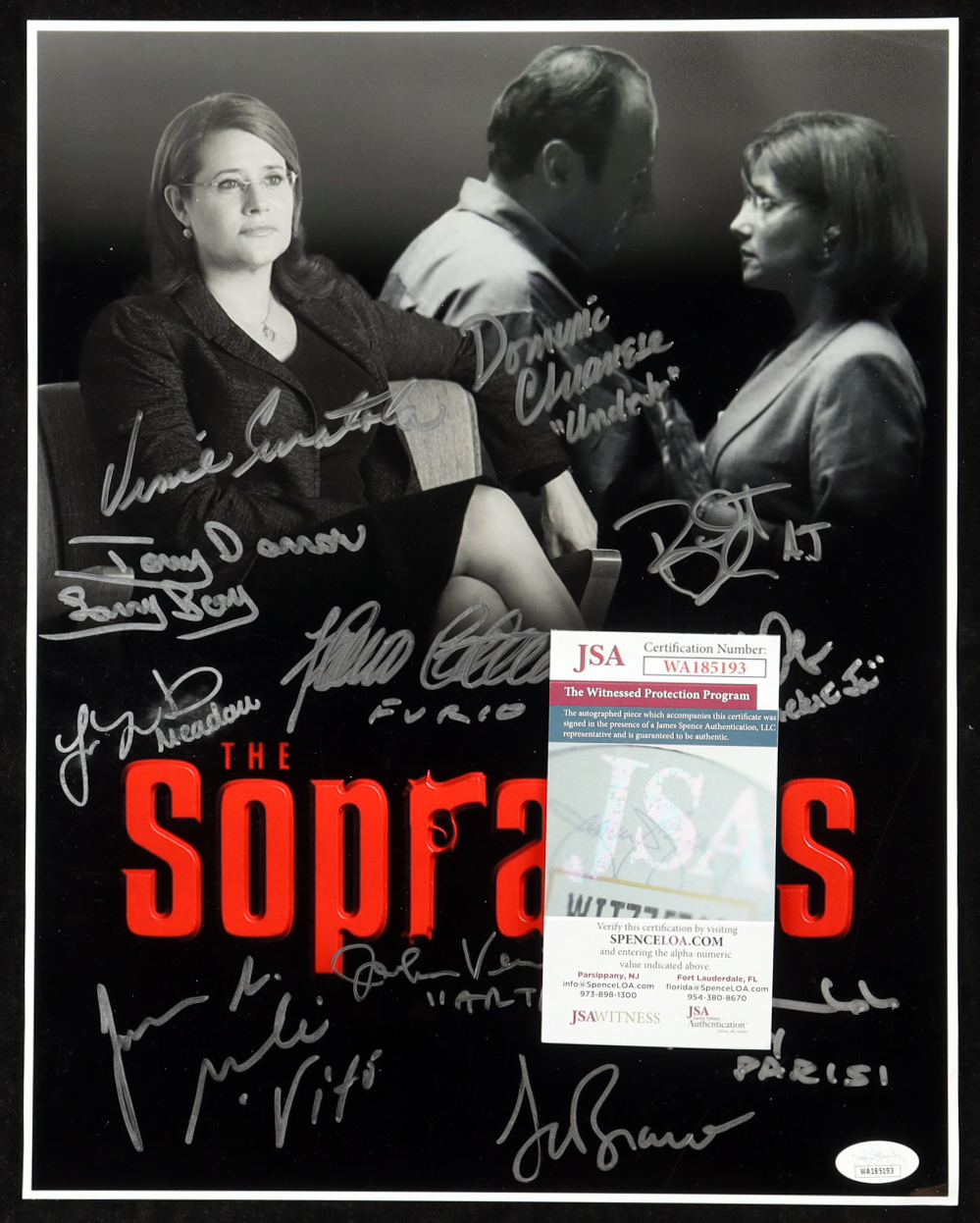 Print measures 11" x 14" in size and has been hand-signed by (9) with Lorraine Bracco, Federico Castelluccio, Dan Grimaldi, Vincent Curatola, Jason Cerbone, Tony Darrow, Joseph Gannascoli,Robert Iler, and Jamie-Lynn Sigler. Please refer to photos regarding the condition of the item.