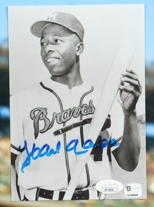 Custom frame measures 22" x 26" in size. Photograph is hand-signed by Hank Aaron (Atlanta Braves, HOF).