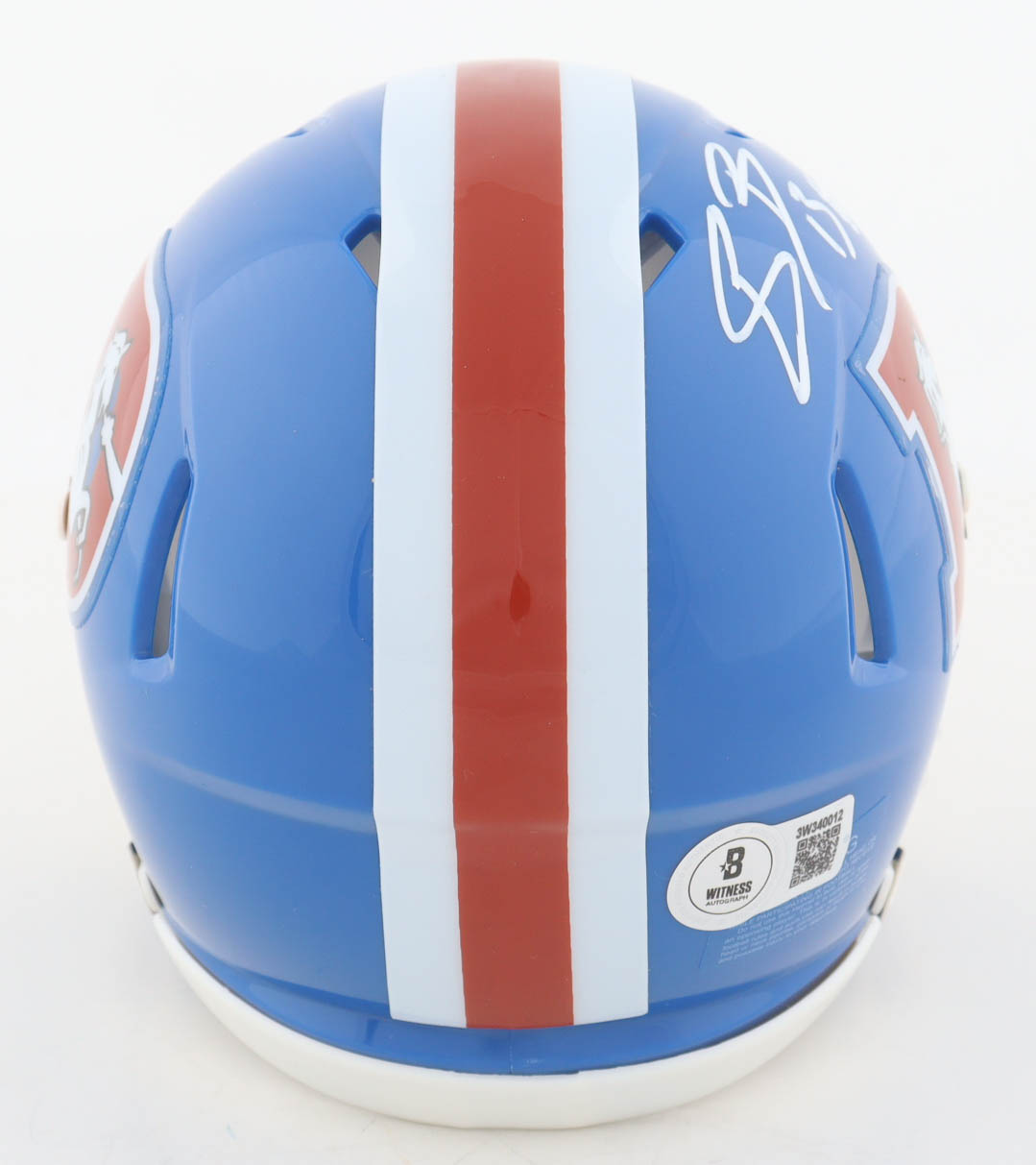 Riddell Denver Broncos Throwback Alternate Speed mini helmet has been hand-signed by Pat Bryant.