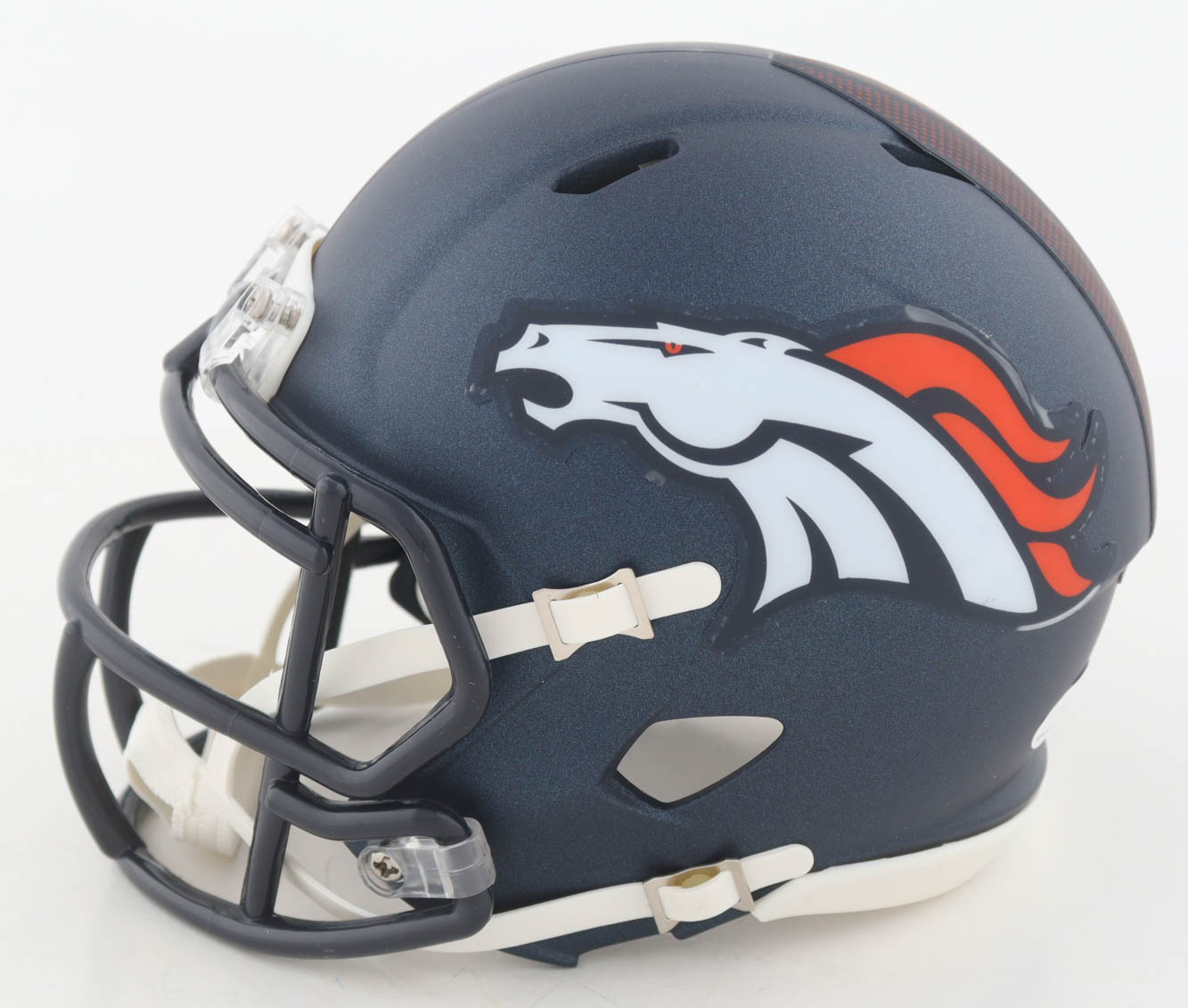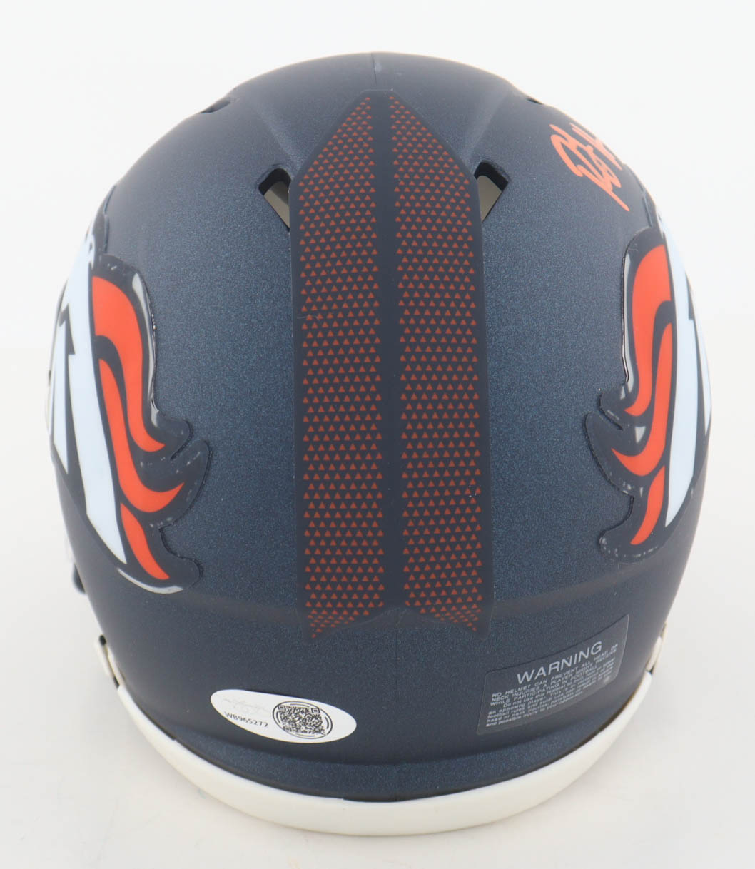 Riddell Denver Broncos Speed mini helmet has been hand-signed by RJ Harvey.