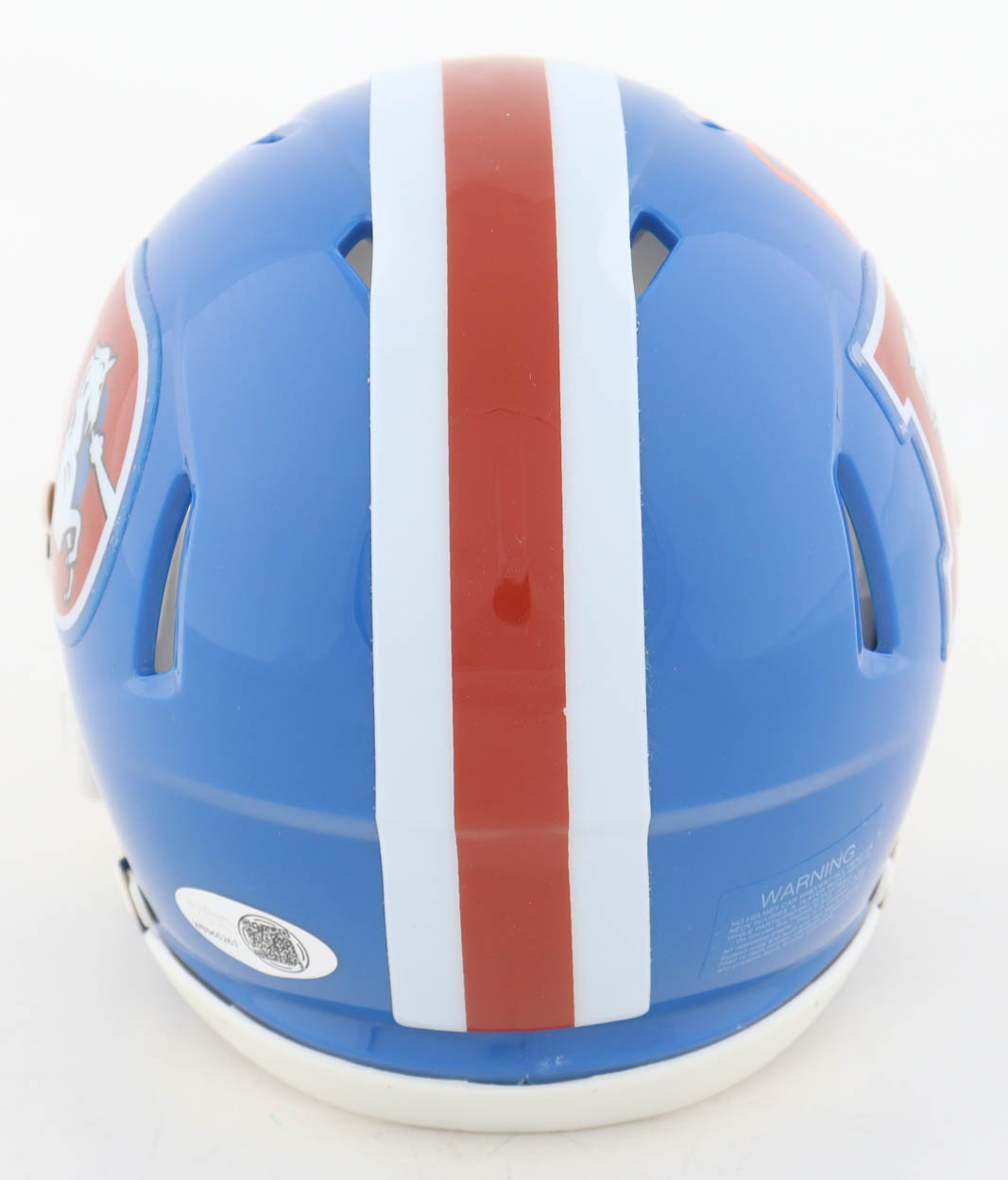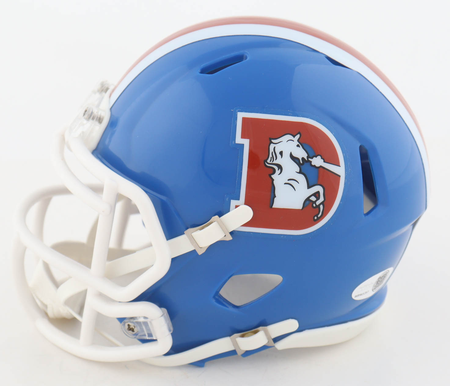 Riddell Denver Broncos Throwback Alternate Speed mini helmet has been hand-signed by RJ Harvey.