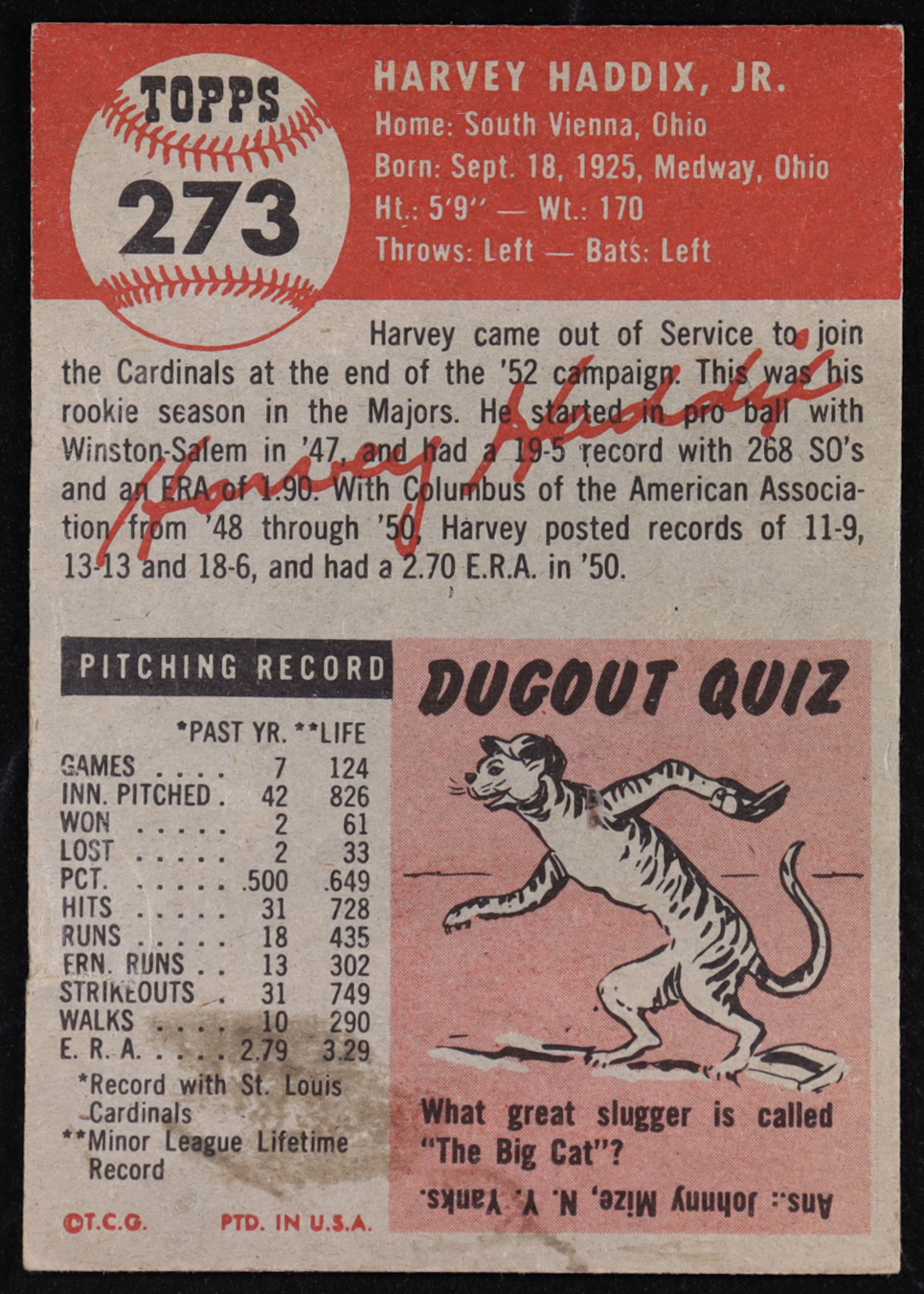 Harvey Haddix 1953 Topps #273 RC