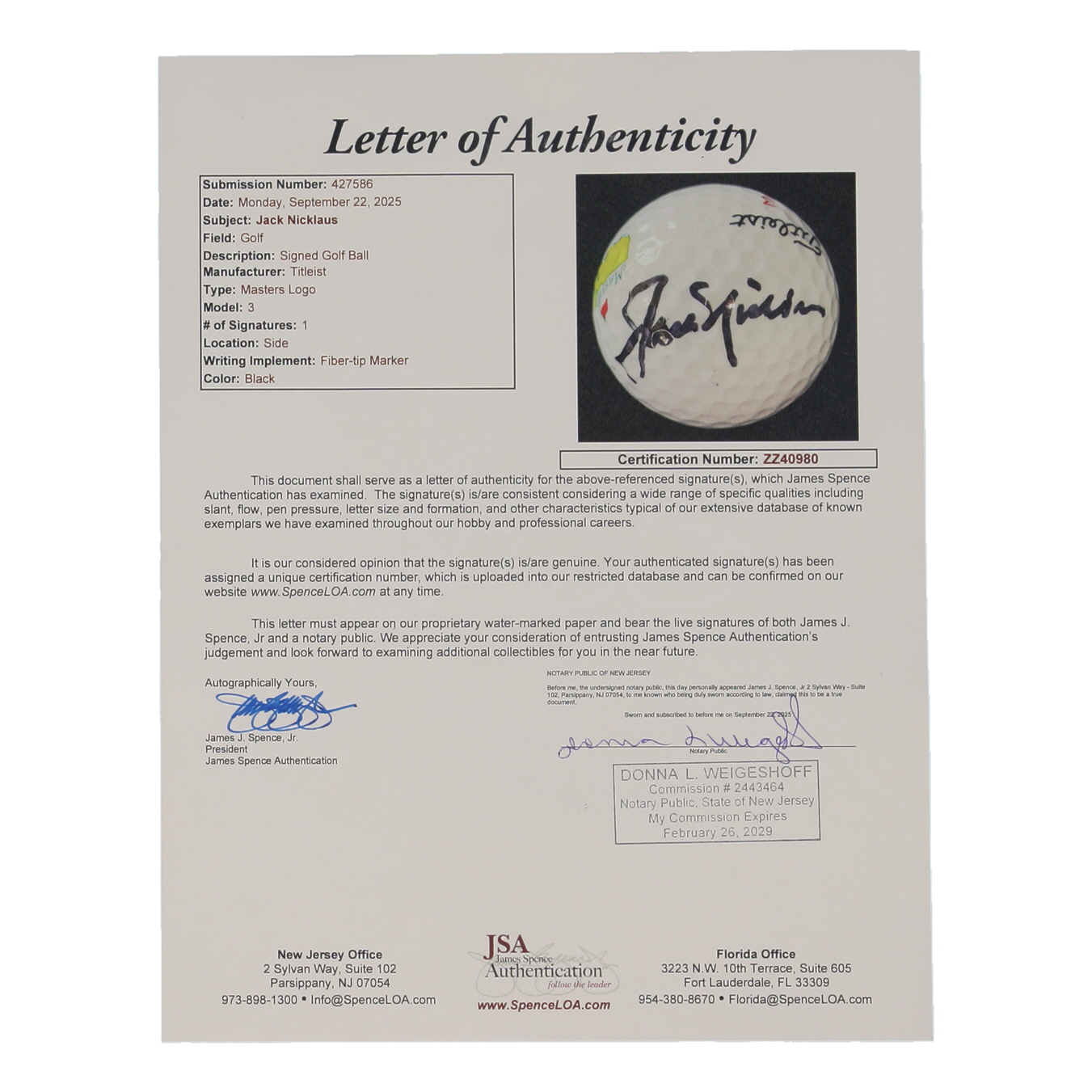 Jack Nicklaus Signed Masters Logo Golf Ball (JSA)