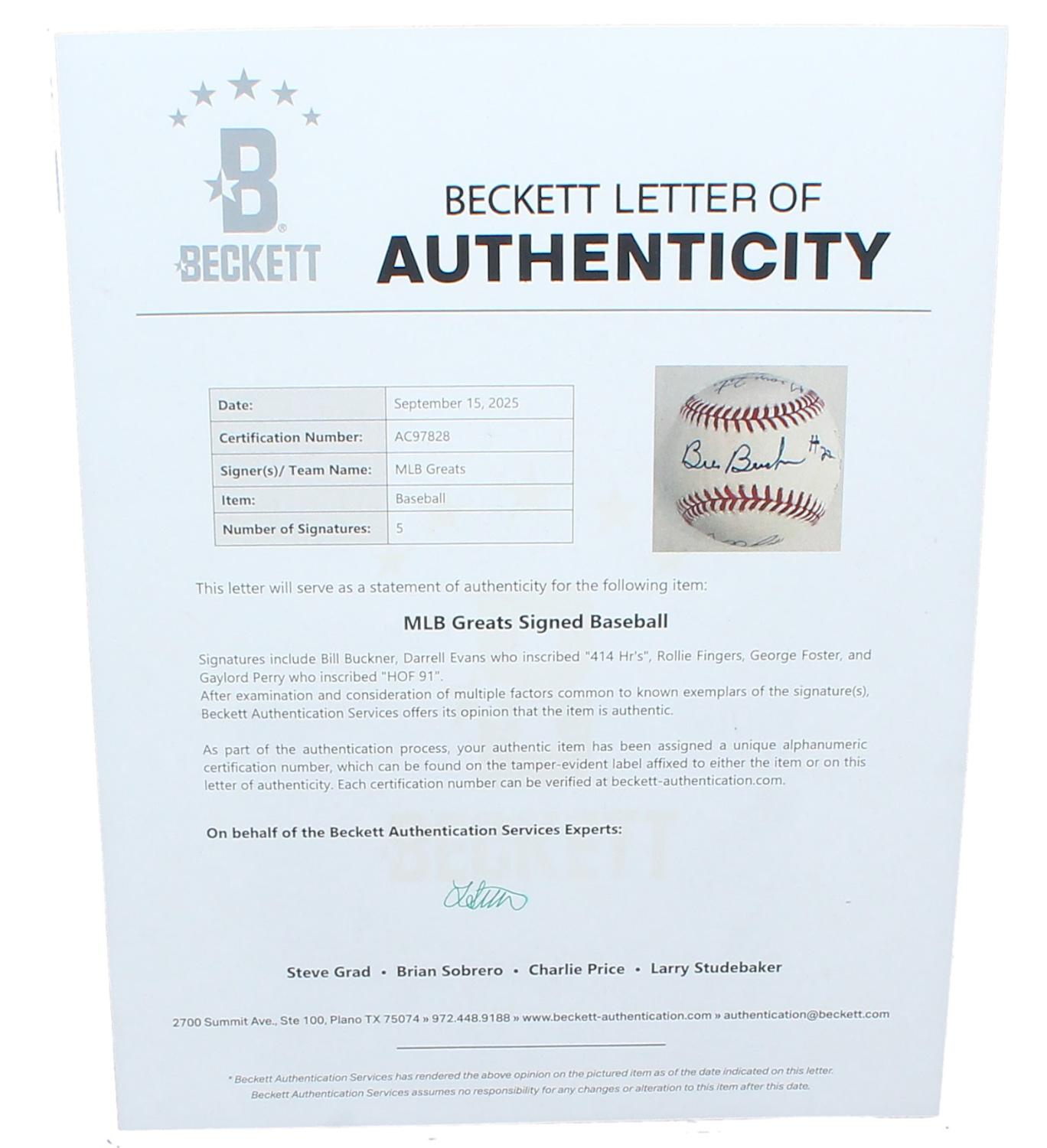 MLB Greats OML Baseball Signed By (5) with Bill Buckner, Gaylord Perry, Darrell Evans, Rollie Fingers & George Foster (Beckett)