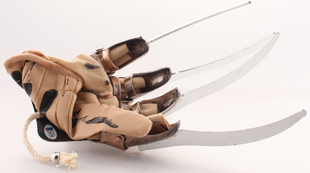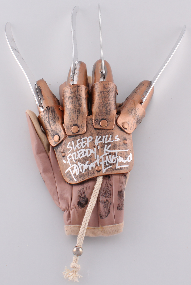 Rubie's Costume Freddy Krueger replica glove. Hand-signed in silver paint pen by Robert Englund (Freddy Krueger).