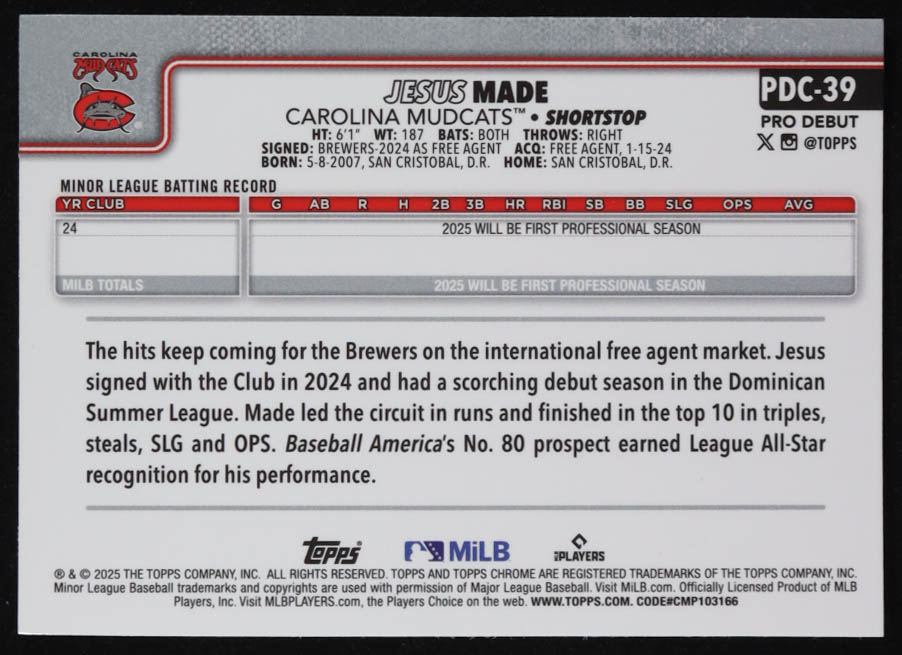 Jesus Made 2025 Topps Pro Debut Chrome Blue Refractors #PDC39 #38/150 RC