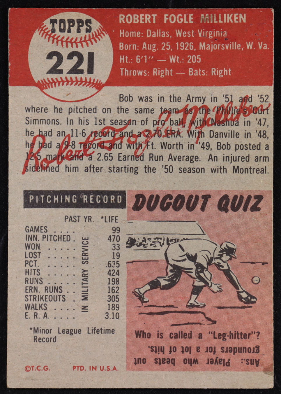 Bob Milliken 1953 Topps #221 RC