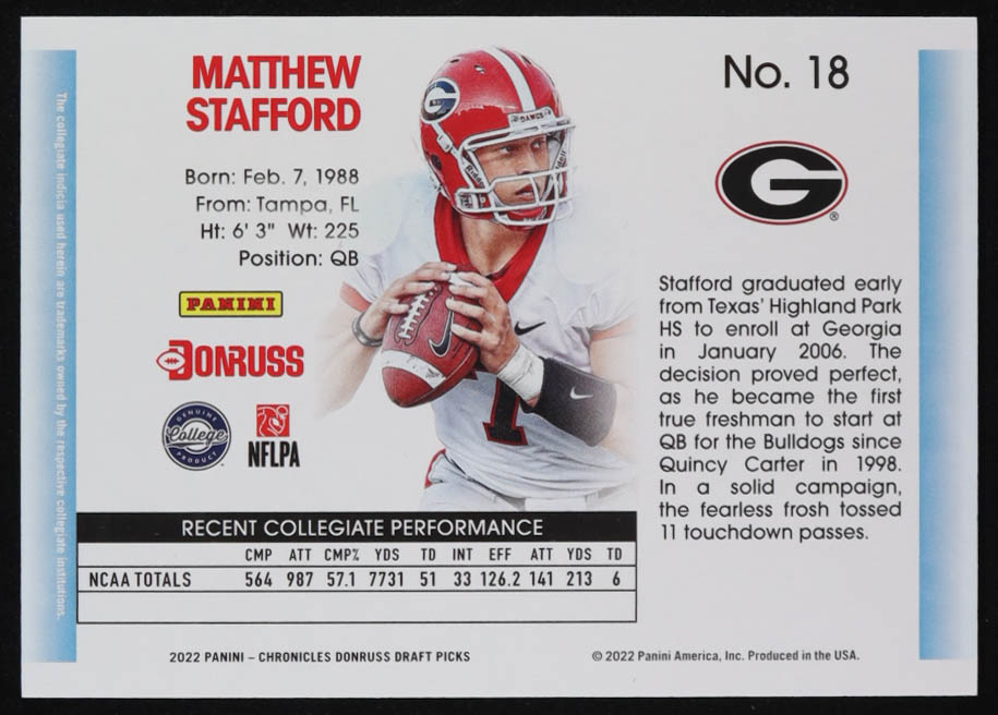 Matthew Stafford 2022 Panini Chronicles Draft Picks Donruss Retro Red #18 #68/149