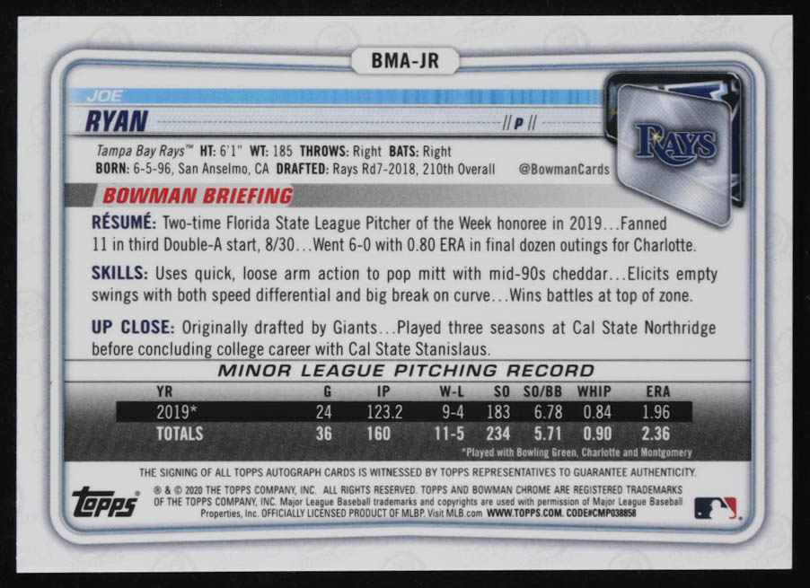 Joe Ryan 2020 Bowman Chrome Mega Box Prospect Autograph Refractors #BMAJR RC