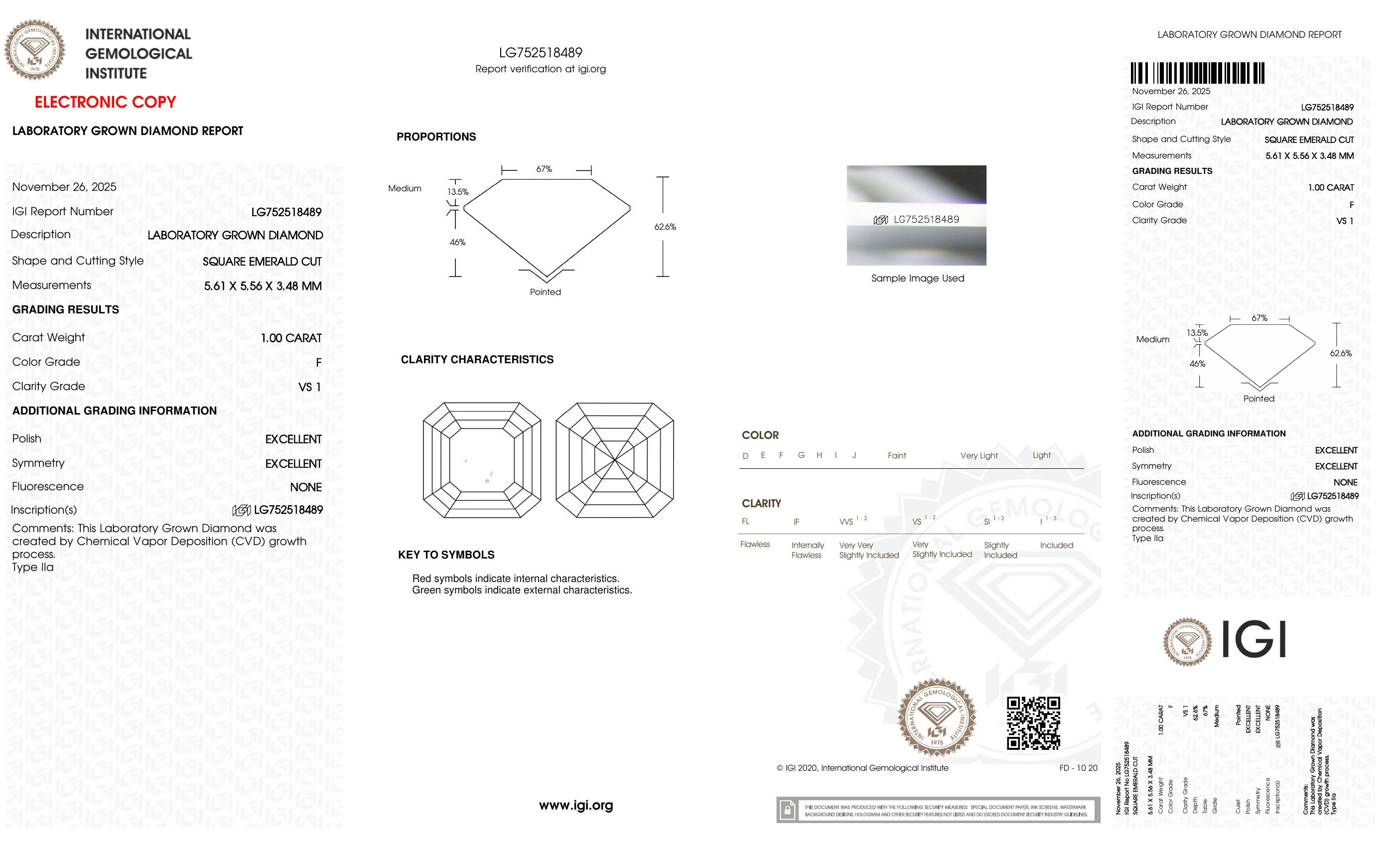1.00 Carats Lab Grown Diamond Loose F, VS1 | (IGI Cert)