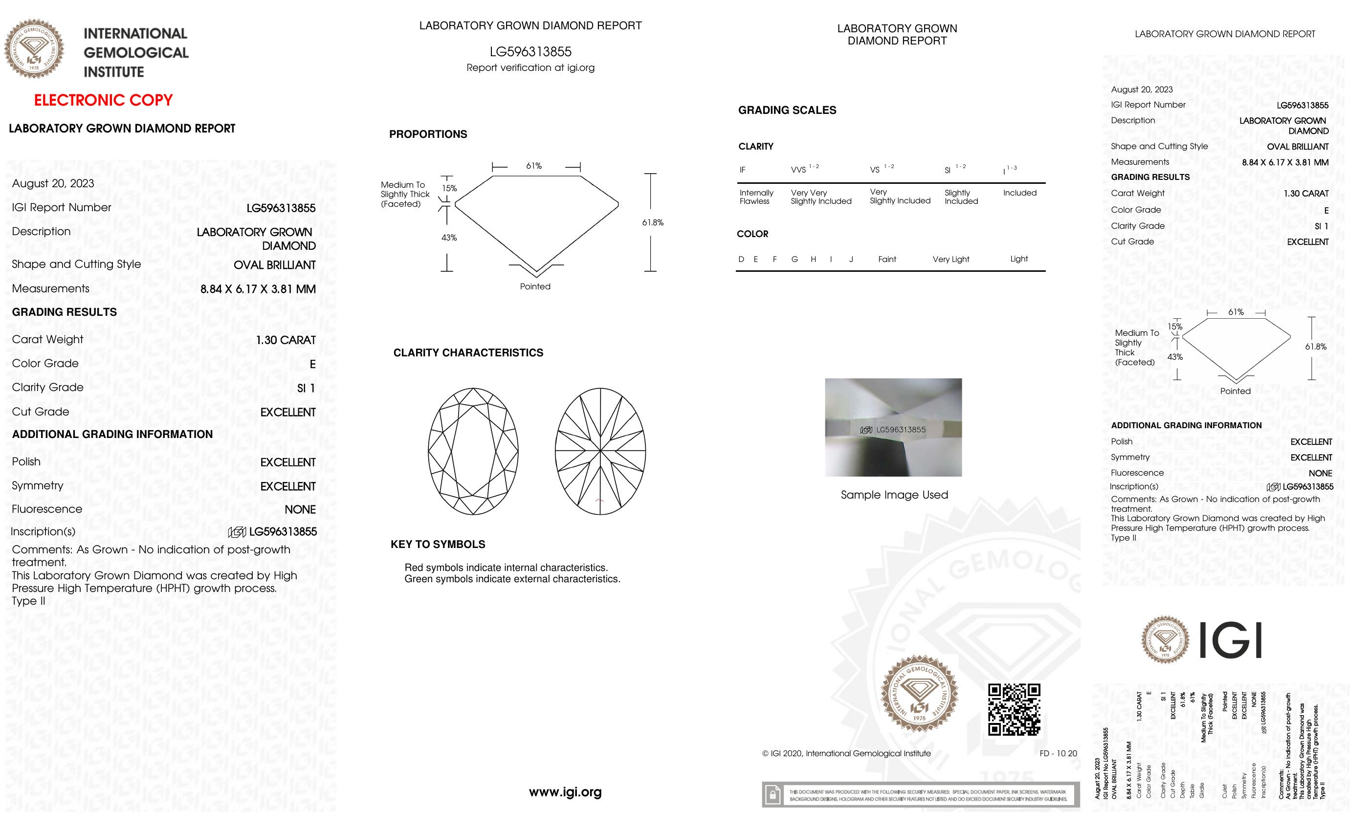 1.30 Carats Lab Grown Diamond Loose E, SI1 | $1,900 Estimated Retail Value (UGL & IGI Certs)