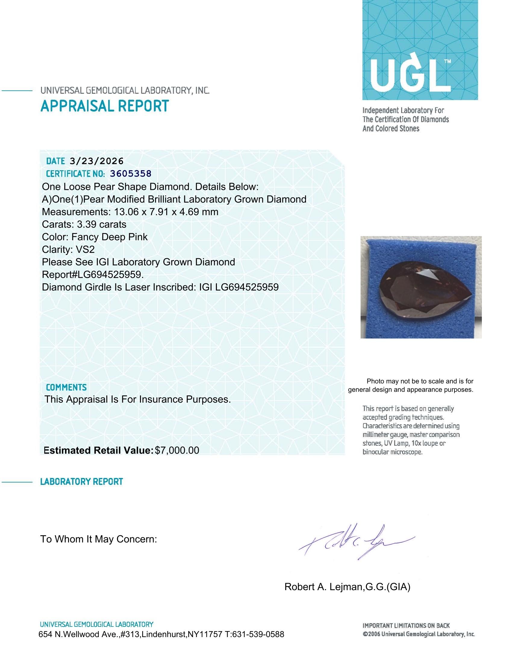 3.39 Carats Lab Grown FANCY DEEP PINK Diamond Loose VS2 | $7,000 Estimated Retail Value (UGL & IGI Certs)