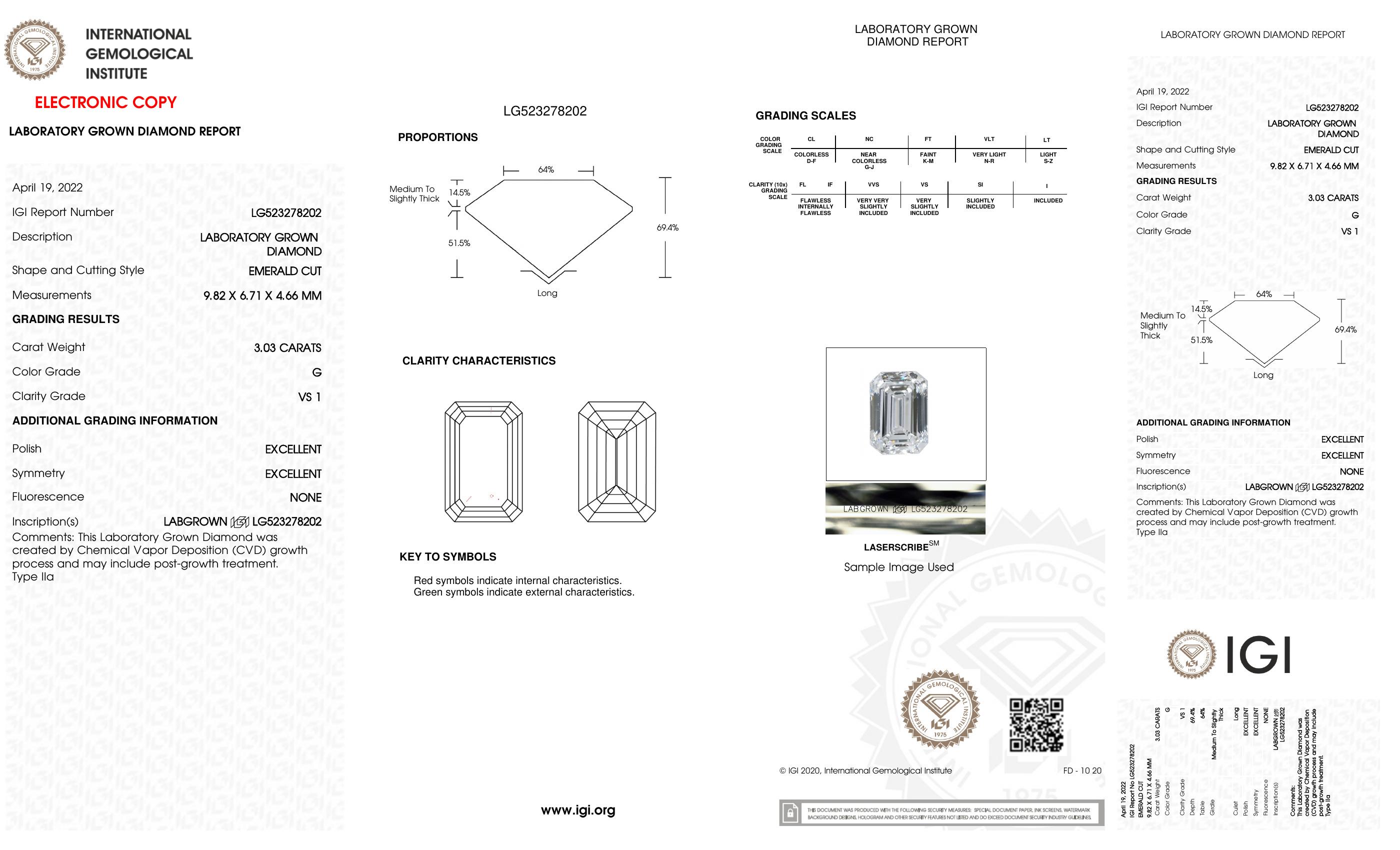 This piece includes paperwork from the International Gemological Institute (IGI) and Universal Gemological Laboratory (UGL). The IGI cert is digital.