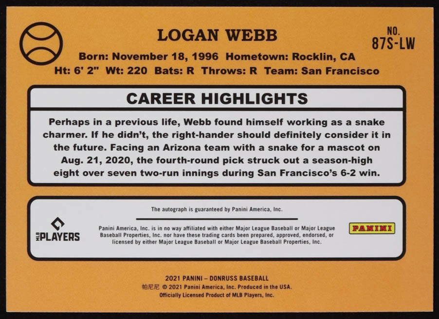 Logan Webb 2021 Donruss Retro '87 Signatures #52