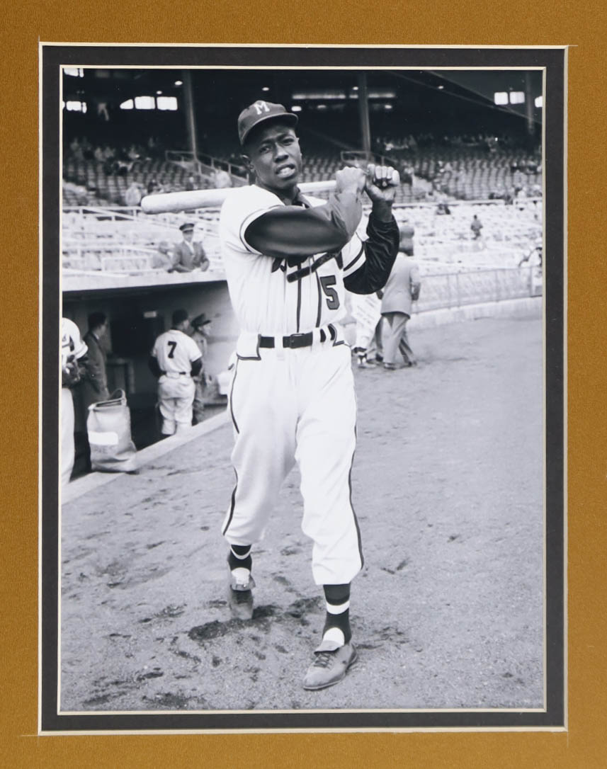 Custom frame measures approximately 32" x 36" in size and features a cut that has been hand-signed by Hank Aaron (D. 2021, Atlanta Braves, HOF). Display also includes an unsigned jersey, (2) 8" x 10" photos, lapel pin, and (2) cloth team logo patches. Please refer to photos regarding the condition of the item.