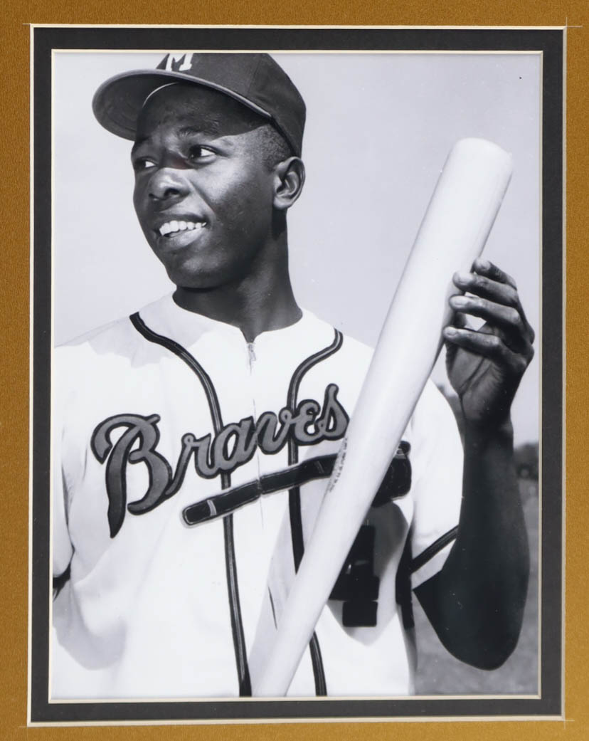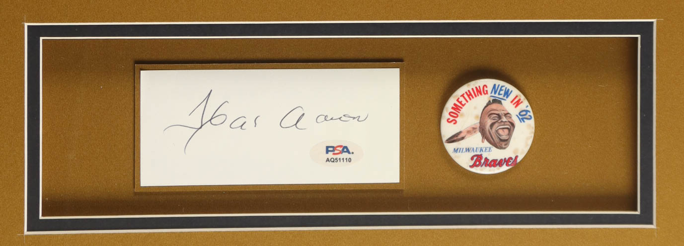 Hank Aaron Signed Custom Framed Cut Display with Vintage 1962 Braves Lapel Pin (PSA)