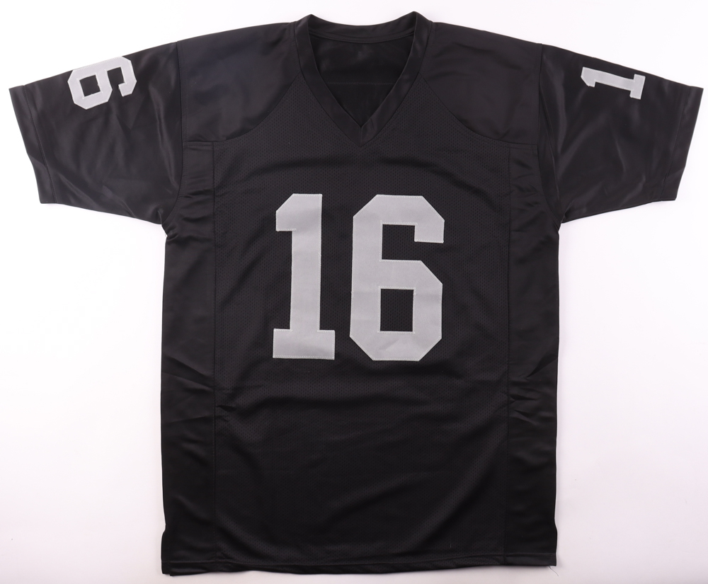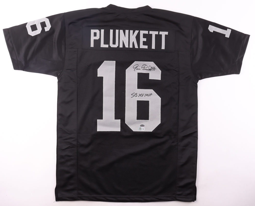 Custom jersey with everything sewn on, size XL. Hand-signed and inscribed by Jim Plunkett.