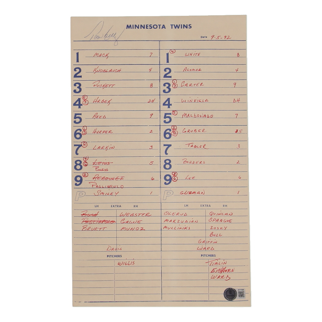 Minnesota Twins game-used batting order lineup card dated September 5, 1992 measures 8.5" x 14" and has been hand-signed by Tom Kelly (Minnesota Twins).
