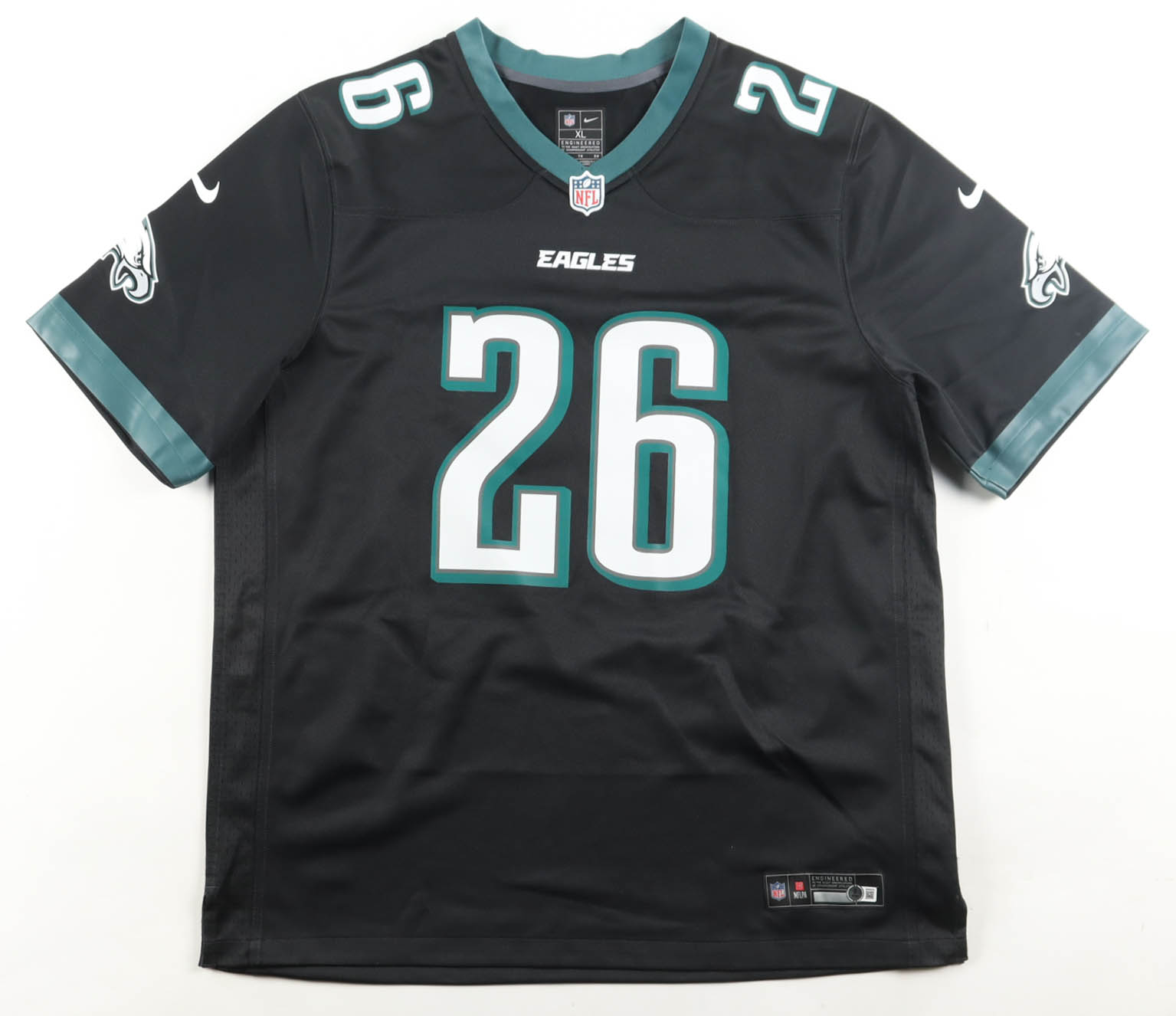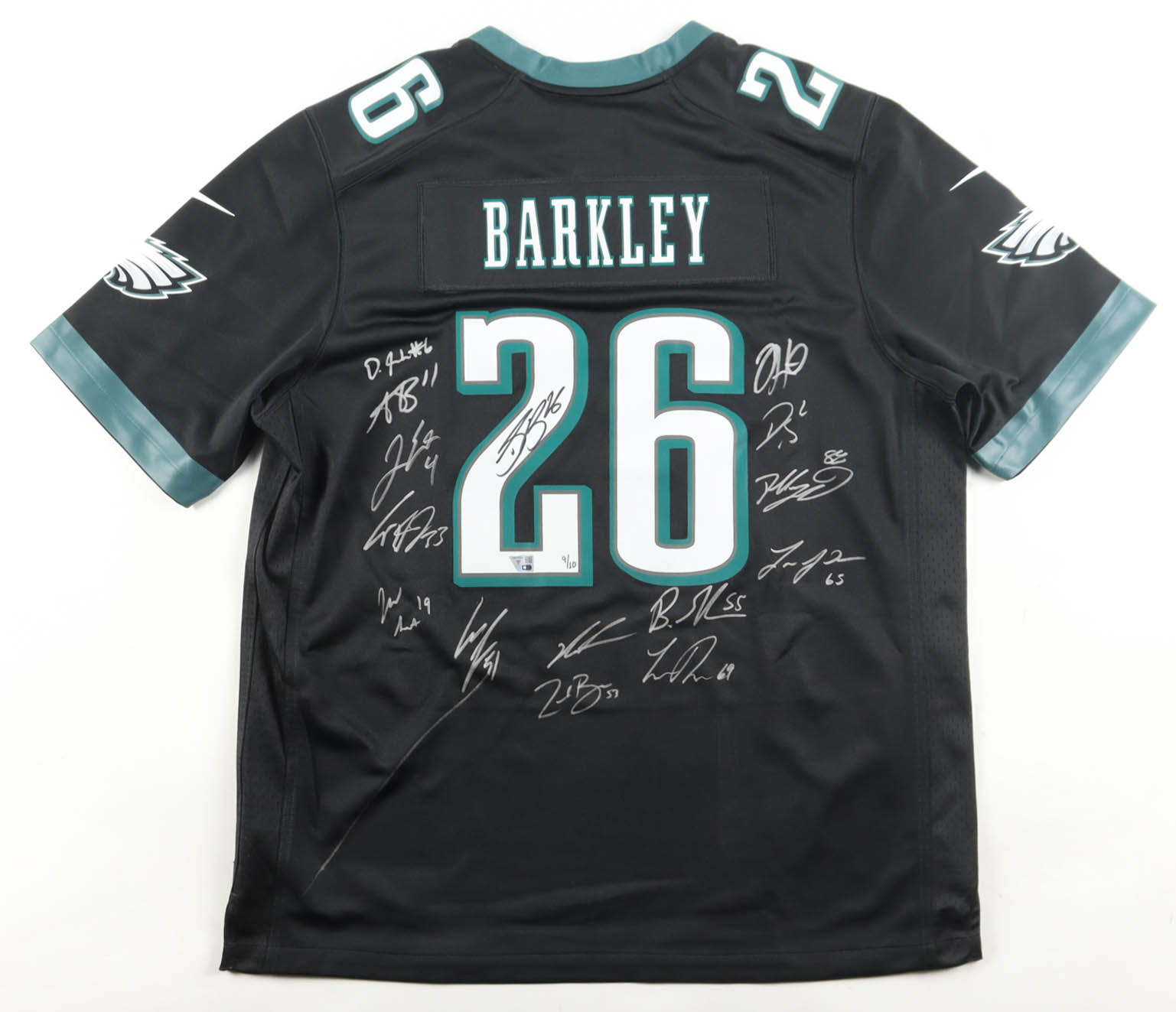 Eagles LE Nike Authentic Jersey Team-Signed By (15) with Jalen Hurts, Dallas Goedert, Saquon Barkley, Darius Slay