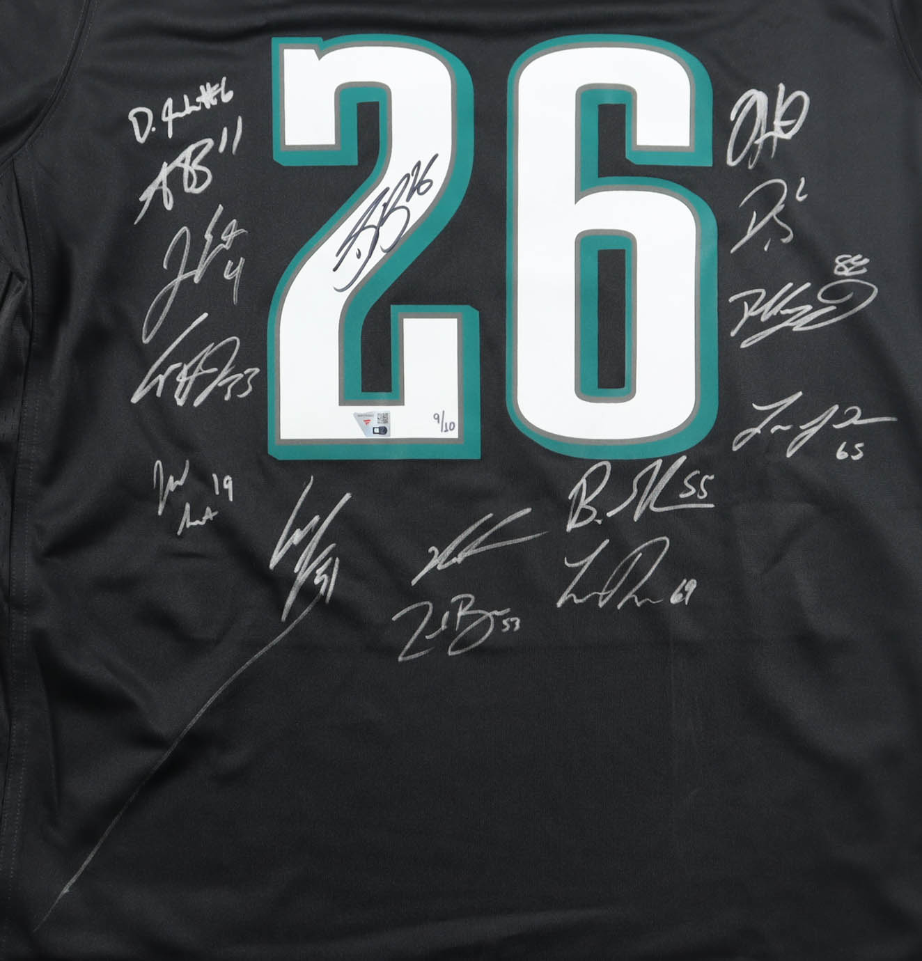 Nike authentic jersey with everything pressed on, size XL. Hand-signed by (15) with Jalen Hurts, Dallas Goedert, Cooper DeJean, DeVonta Smith, Saquon Barkley, A.J. Brown, Zack Baun, Jalen Carter, Darius Slay, Brandon Graham, Landon Dickerson, Cam Jurgens, Lane Johnson, Josh Sweat, and Jake Elliott. Jersey is hand-written limited edition #9/10. Please note, there is a stray pen mark below Jurgens' signature.