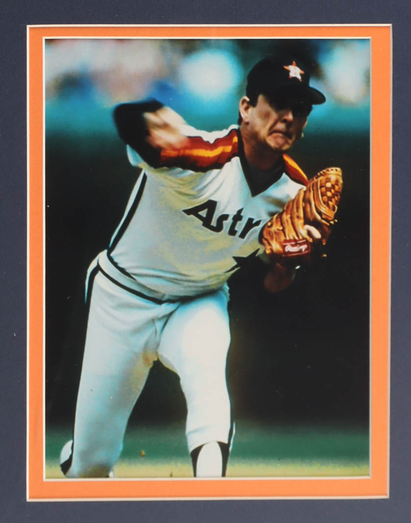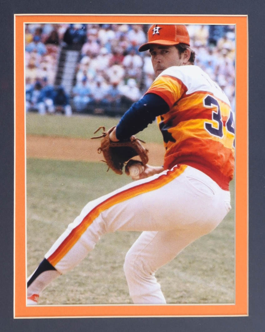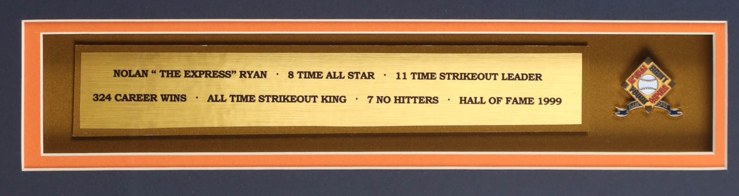 Custom frame display measures approximately 32" x 36" in size and features a jersey that has been hand-signed and inscribed by Nolan Ryan (Houston Astros, HOF). The display also includes a Hall of Fame pin, (2) 8" x 10" photos and (2) cloth team logo patches and a career statistics plaque. Please see photos for more details regarding the condition of the item.