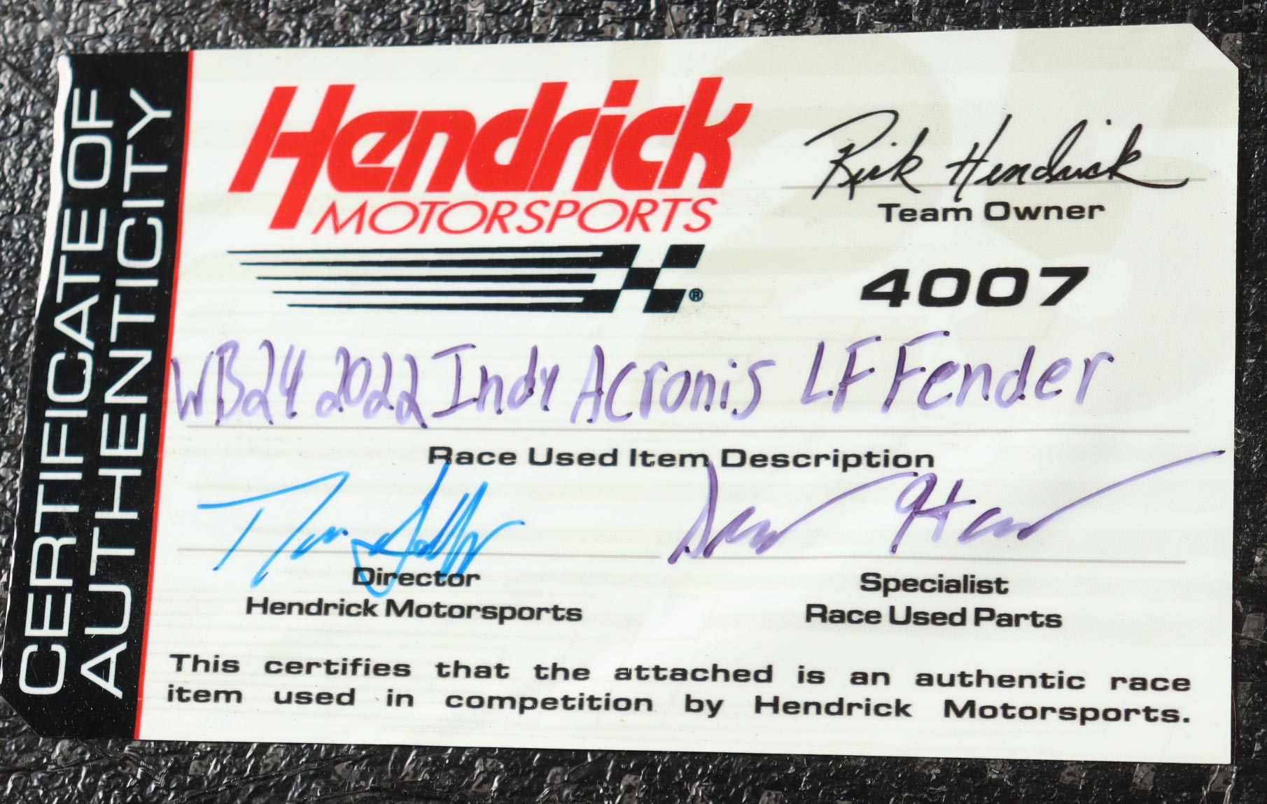Race-Used Left Front Fender Car Piece from William Byron's #24 Acromis used during the 2022 Indianapolis Motor Speedway. Authenticated by the Director and Race Used Parts Specialist at Hendrick Motorsports.