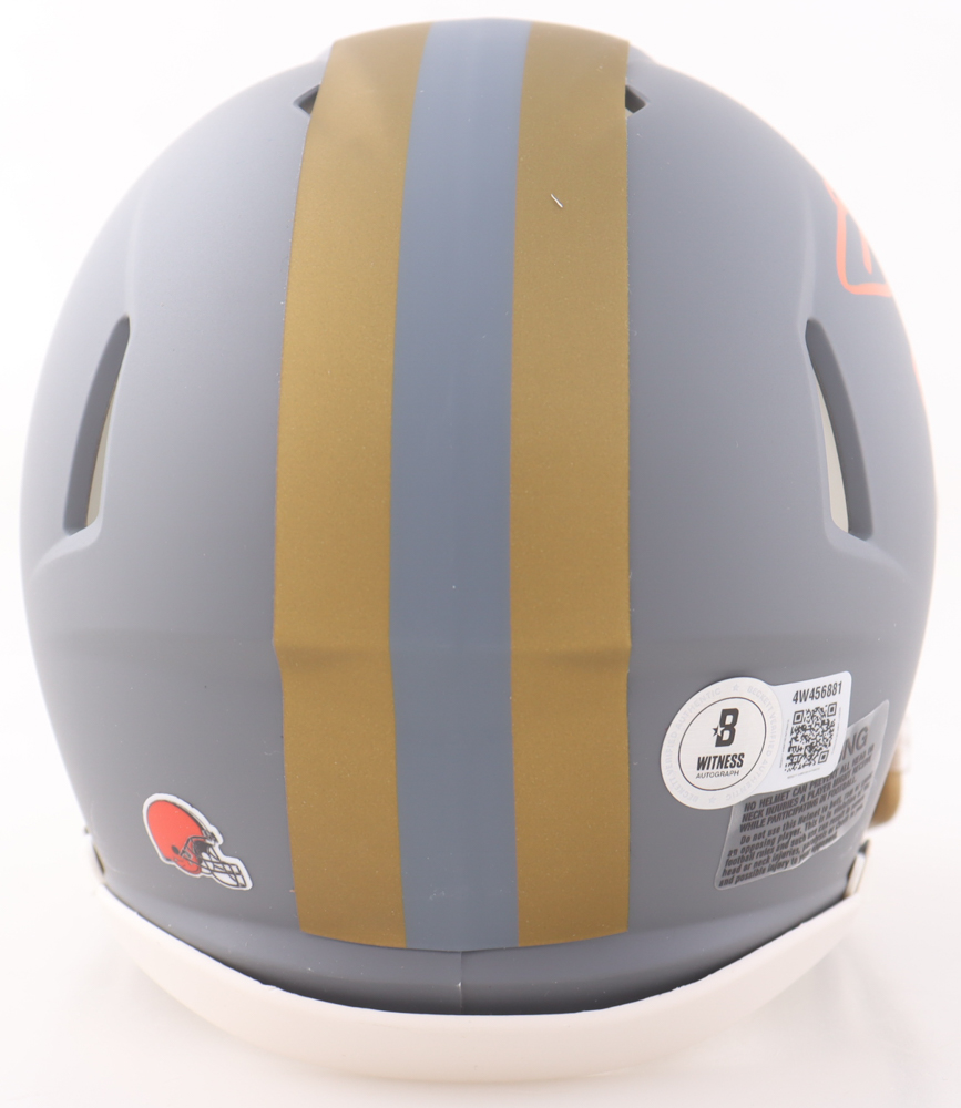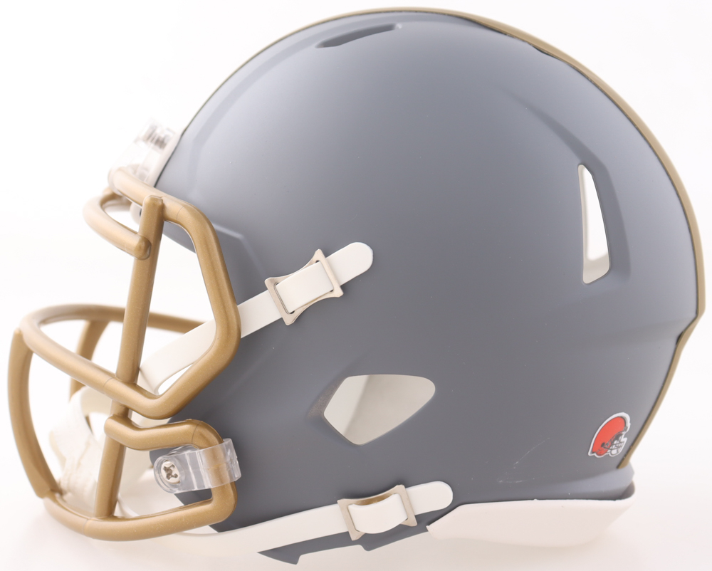 Riddell Cleveland Browns Slate Alternate Speed mini helmet has been hand-signed and inscribed by Johnny Manziel.