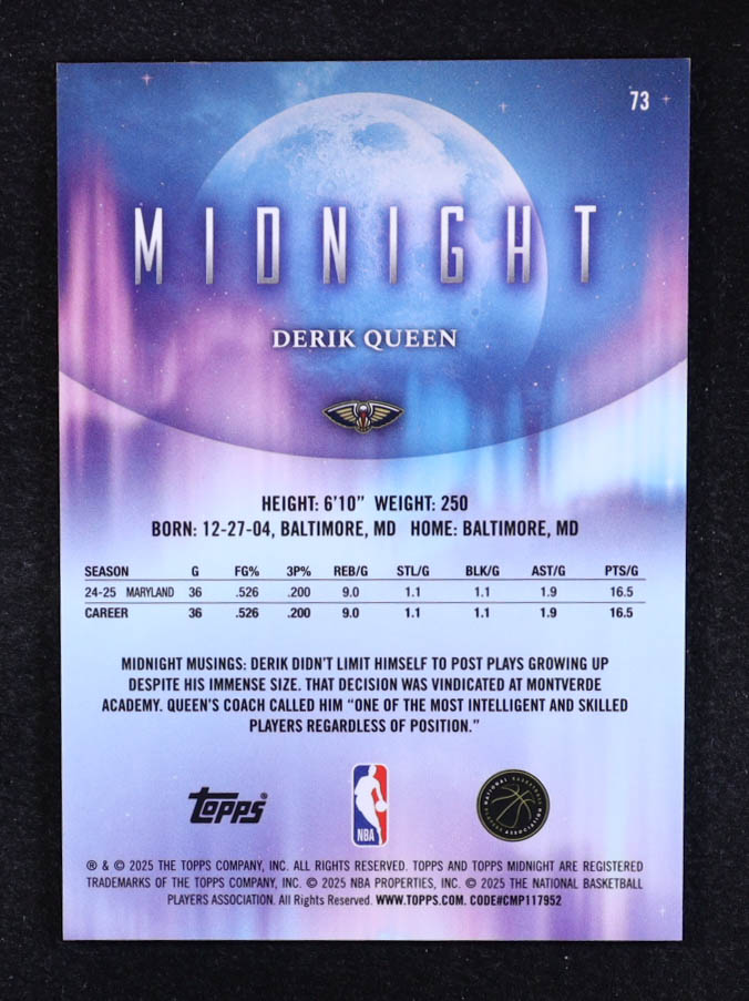 Derik Queen 2025-26 Topps Midnight Moonrise #73 #09/25 RC