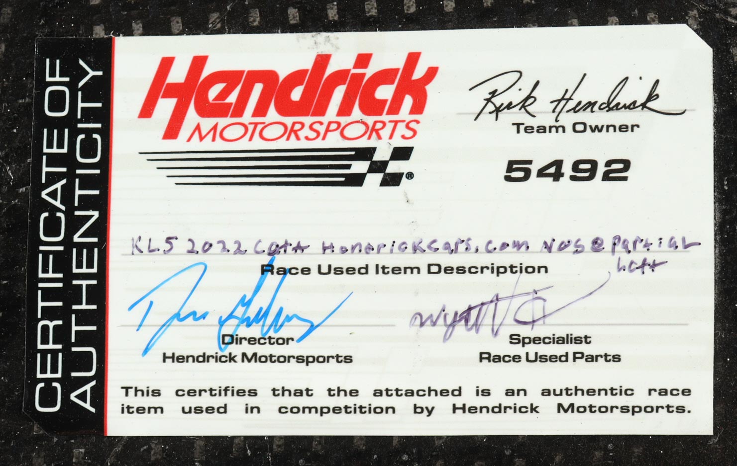 Authentication: Hendrick Motorsports COA