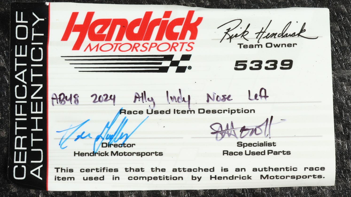 Race-Used Left Nose Car Piece from Alex Bowman's #48 Ally used during the 2024 Indianapolis Motor Speedway. Authenticated by the Director and Race Used Parts Specialist at Hendrick Motorsports.