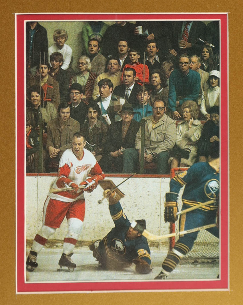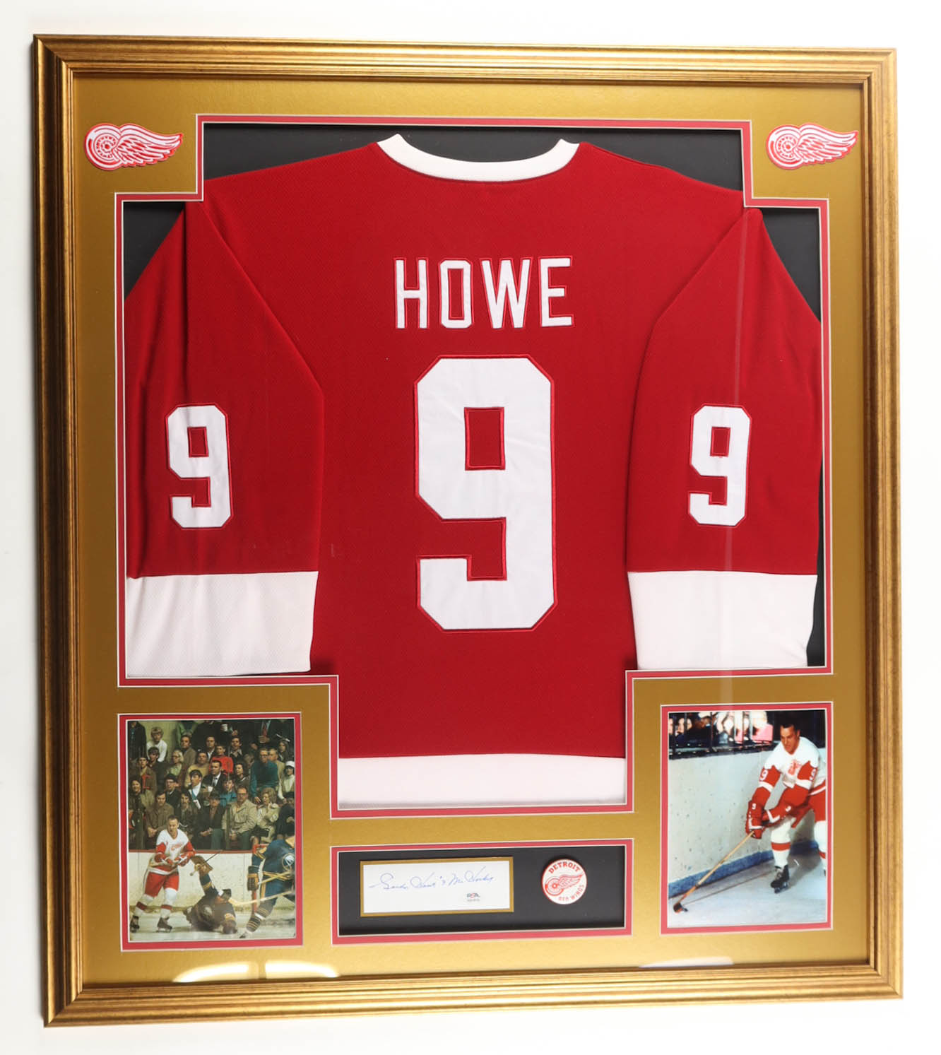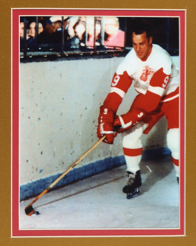 Custom frame display measures approximately 32" x 36" in size and features a jersey and a cut that has been hand-signed by Gordie Howe (D. 2016, HOF). The display also includes a vintage 1970 Red Wings Lapel pins, (2) 8" x 10" photos and (2) cloth team logo patches. Please note, jersey is unsigned. Refer to photos for more details on the condition of the item.