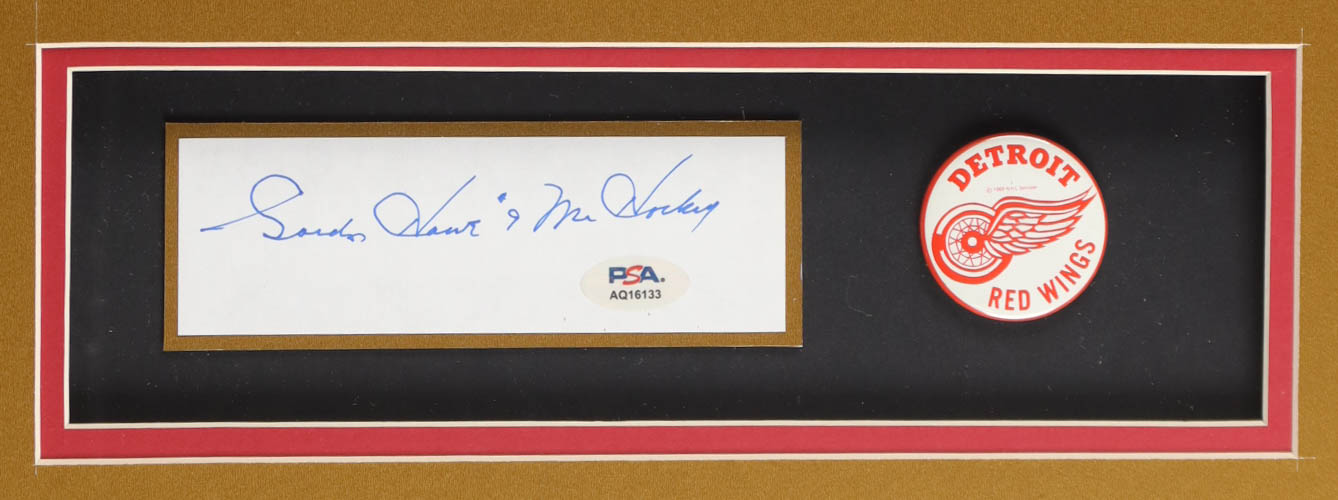 Gordie Howe Signed Custom Framed Cut Display Inscribed "Mr. Hockey" with Jersey & Vintage Lapel Pin (PSA)