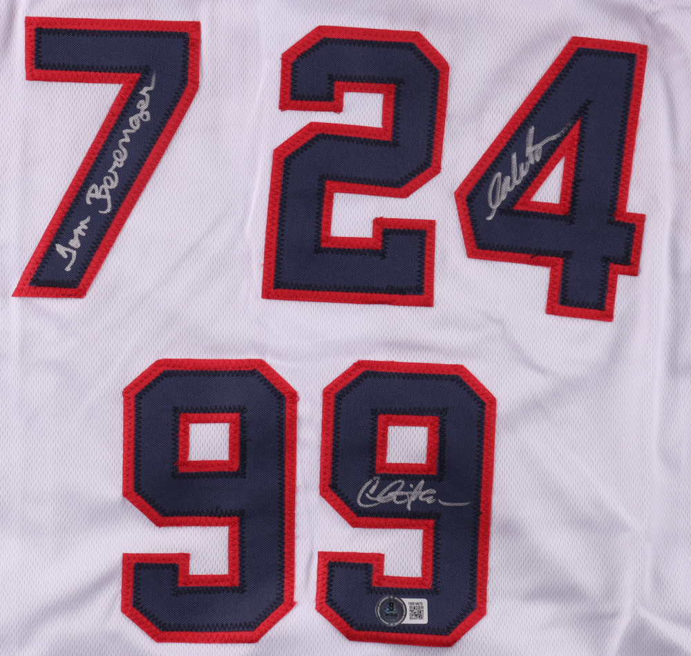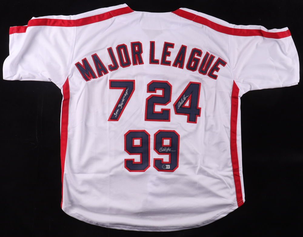 Custom jersey with everything sewn on, size XL. Hand-signed by Charlie Sheen (Ricky "Wild Thing" Vaughn), Tom Berenger (Jake Taylor), and Corbin Bernsen (Roger Dorn).