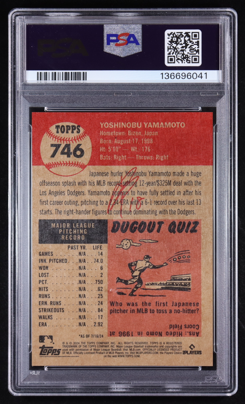 Yoshinobu Yamamoto 2024 Topps Living #746 RC (PSA 10)