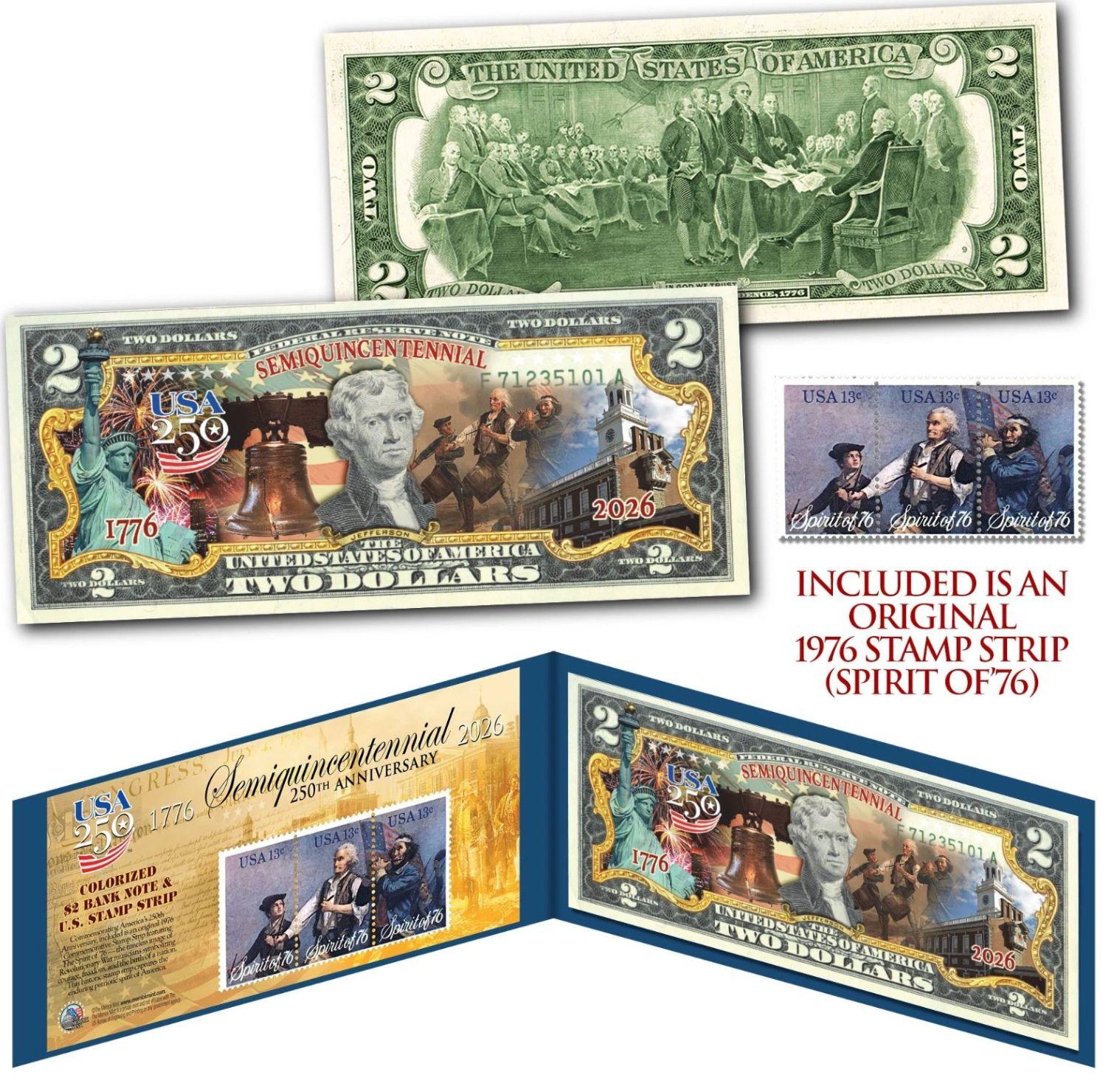 United States of America "250th Anniversary" Spirit of 1776 Genuine Stamps & July 4th USA 250 $2 Bill