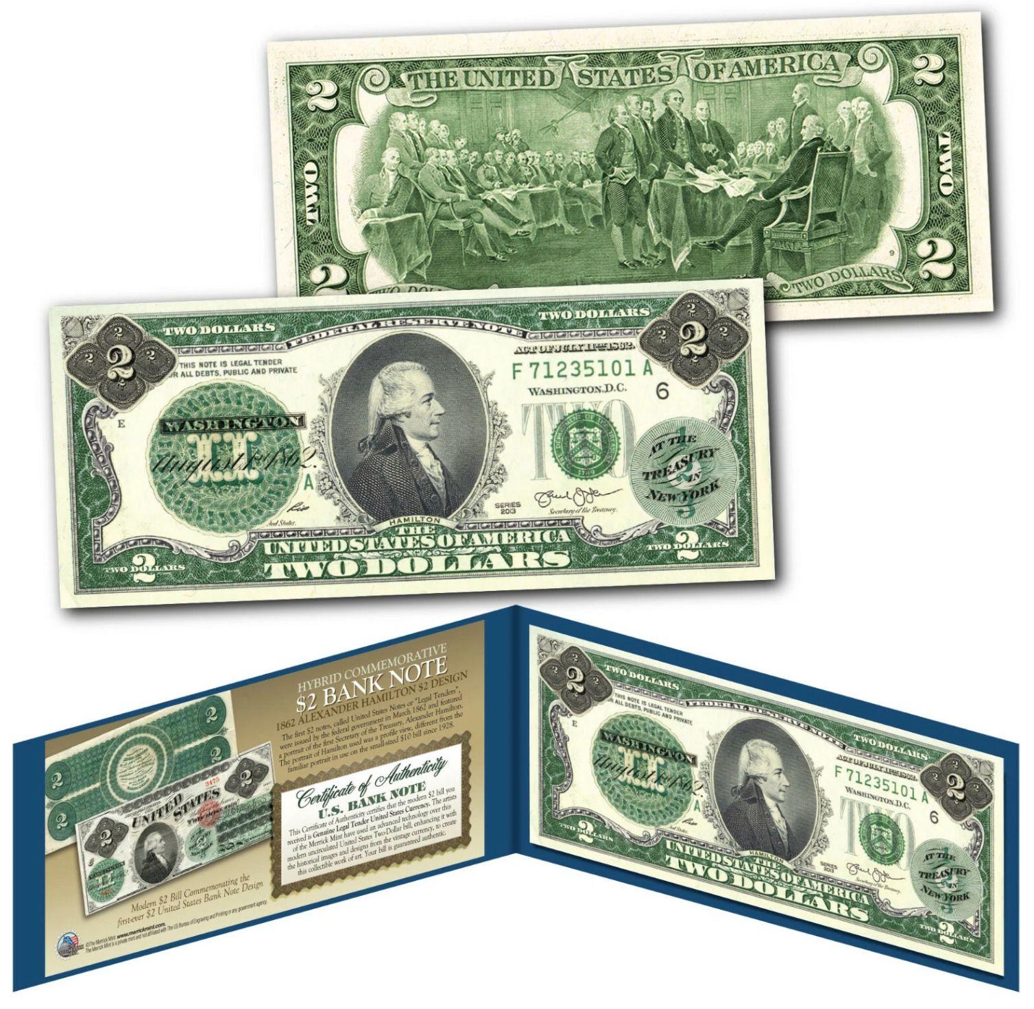 1862 Alexander Hamilton "Civil War Treasury" Two-Dollar Banknote On Modern $2 Bill