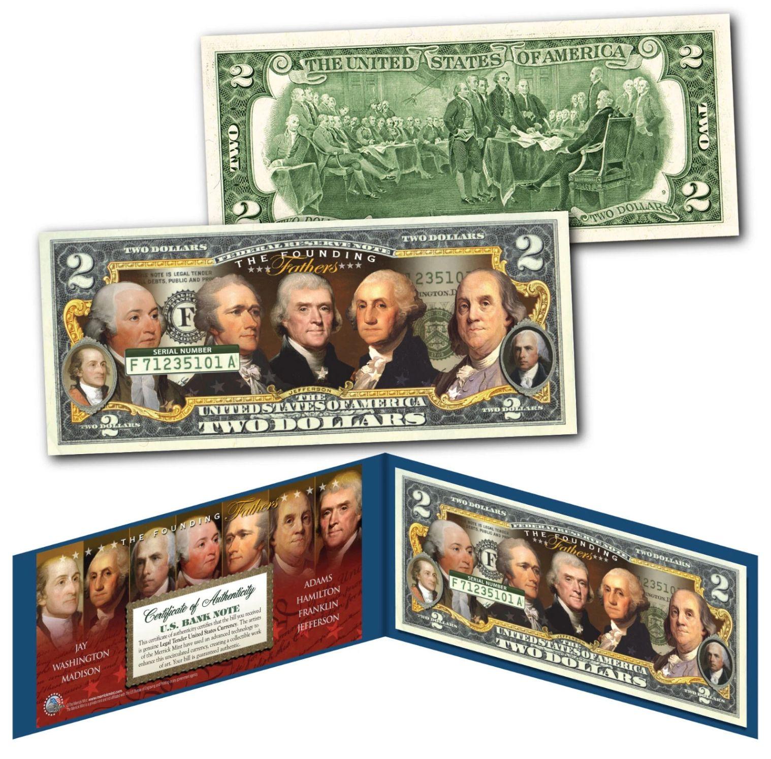 "Founding Fathers of The United States" Colorized Genuine Legal Tender US $2 Bill