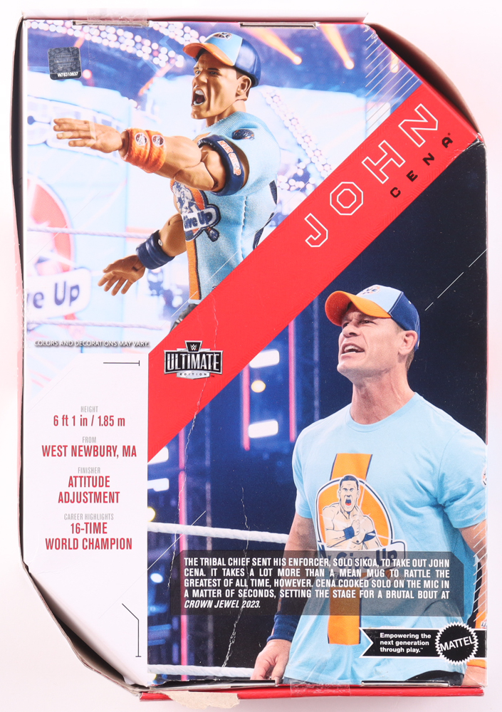 Mattel WWE Ultimate Edition action figure. Hand-signed on the box by John Cena. Please note the creasing and tearing on the packaging.