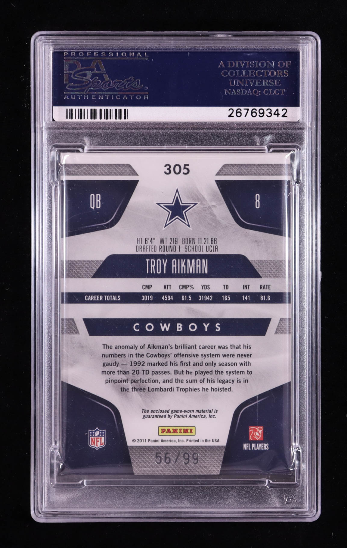 Troy Aikman 2011 Certified Jersey #305 #56/99 (PSA 9)