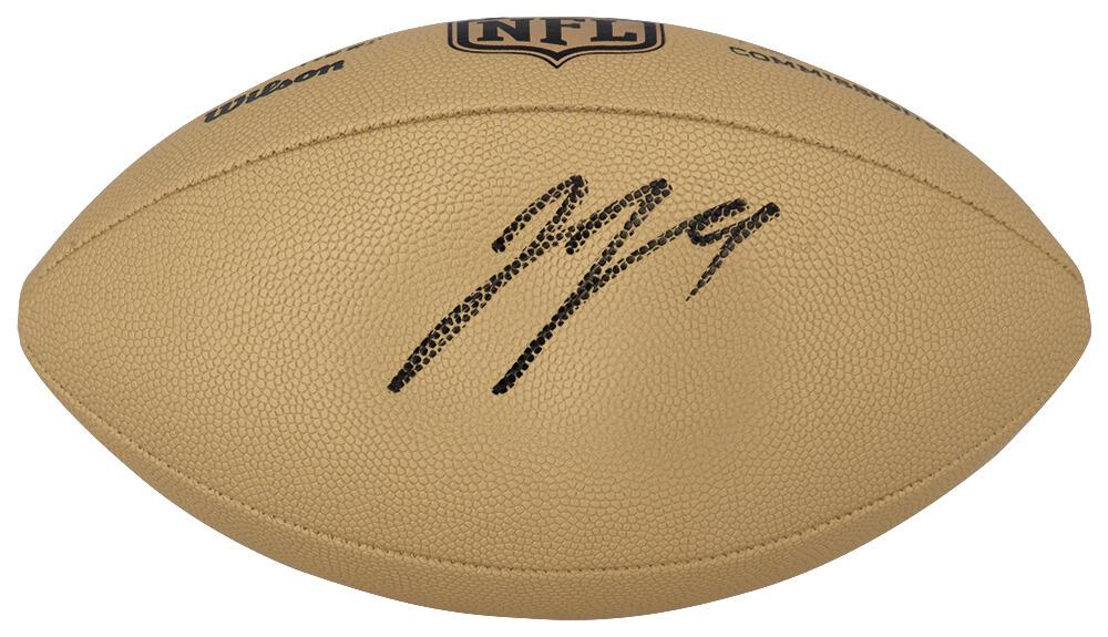 Wilson "The Duke" Metallic Gold football has been hand-signed by J. J. McCarthy (Minnesota Vikings).