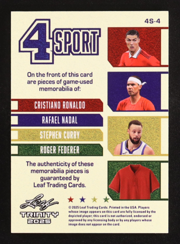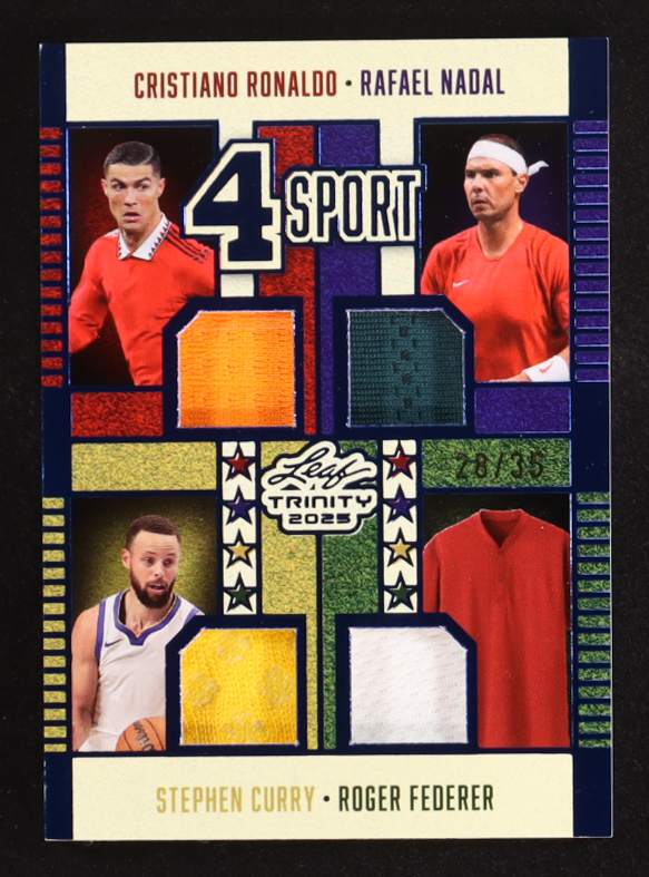 2025 Leaf Trinity 4 Sport Autographs Blue Game-Used #4S4 Cristiano Ronaldo / Rafael Nadal / Stephen Curry / Roger Federer #28/35