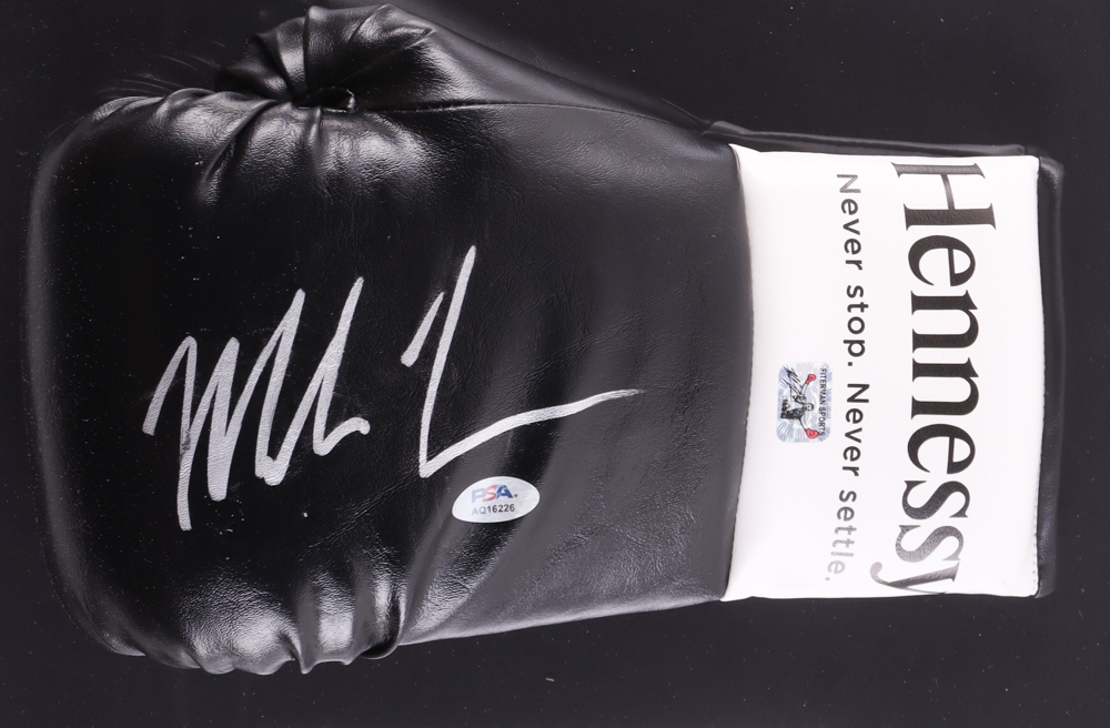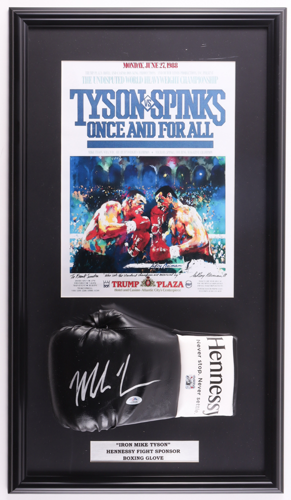 Custom frame measures 17" x 30" in size and features a Hennessy model boxing glove that has been hand-signed by Mike Tyson (HOF). Display also features Trump Plaza fight print. Please see photos for details regarding the condition of the item.