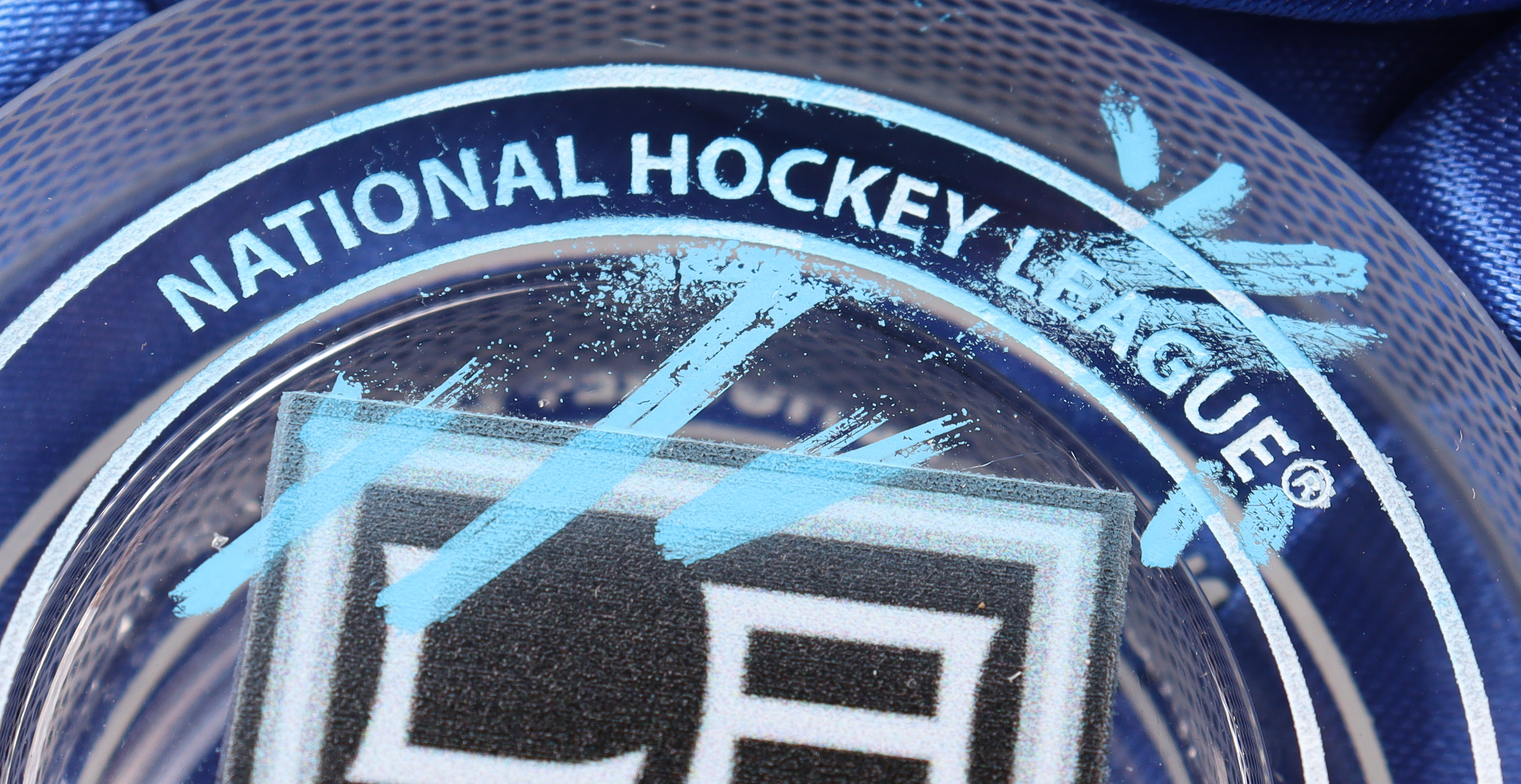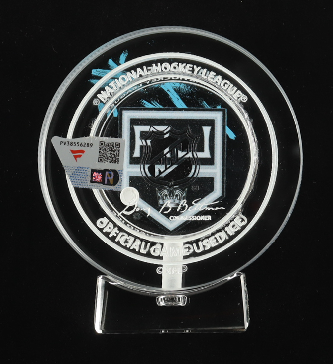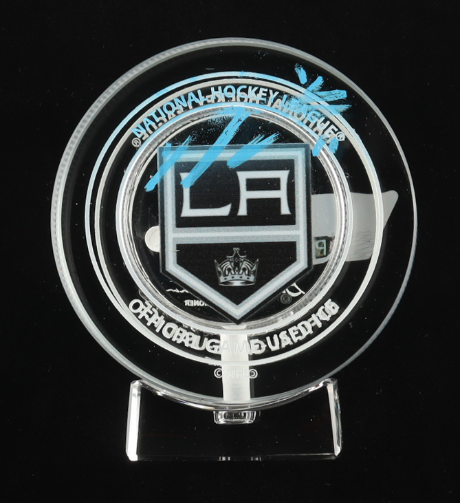 Crystal hockey puck has been filled with ice used during the 2023-24 Los Angeles Kings NHL season. Hand-signed by Anze Kopitar. Please note the smudged signature.