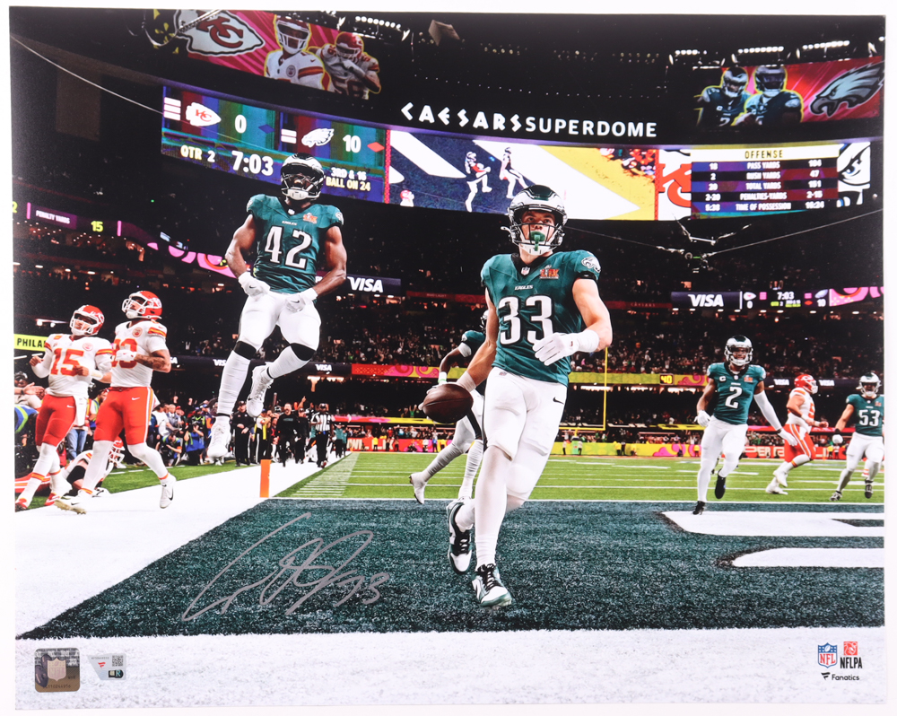 Photo measures 16" x 20" in size and has been hand-signed by Cooper DeJean (Philadelphia Eagles).